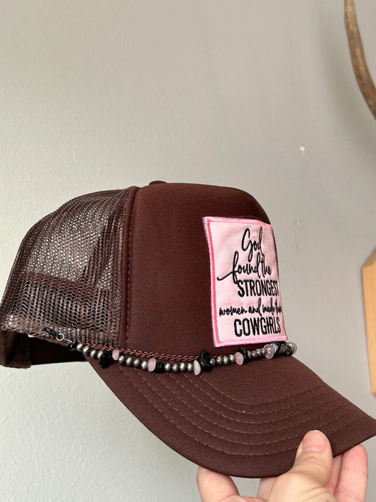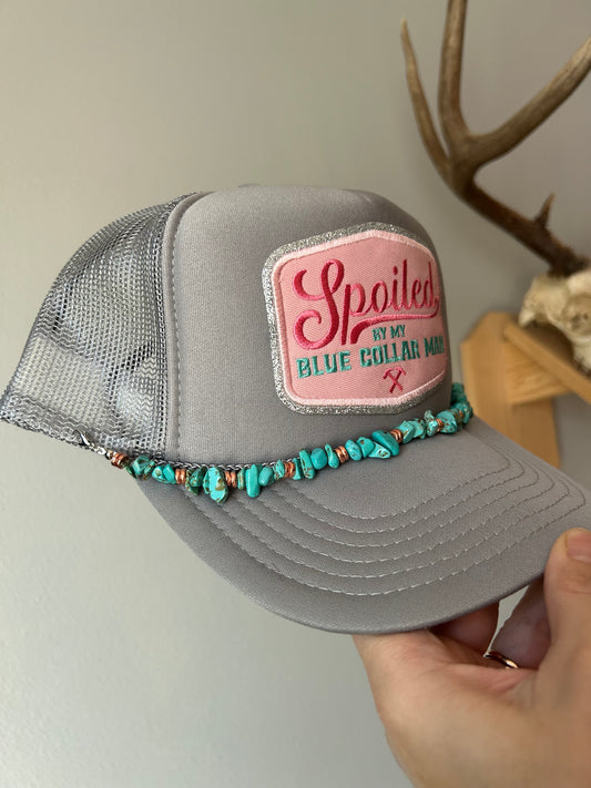 These are original designed trucker and baseball hats, with embroidered patches, and some hand stitching embellishments.
