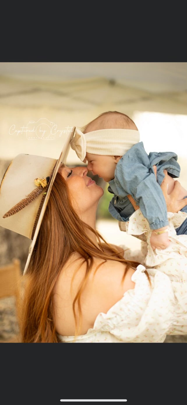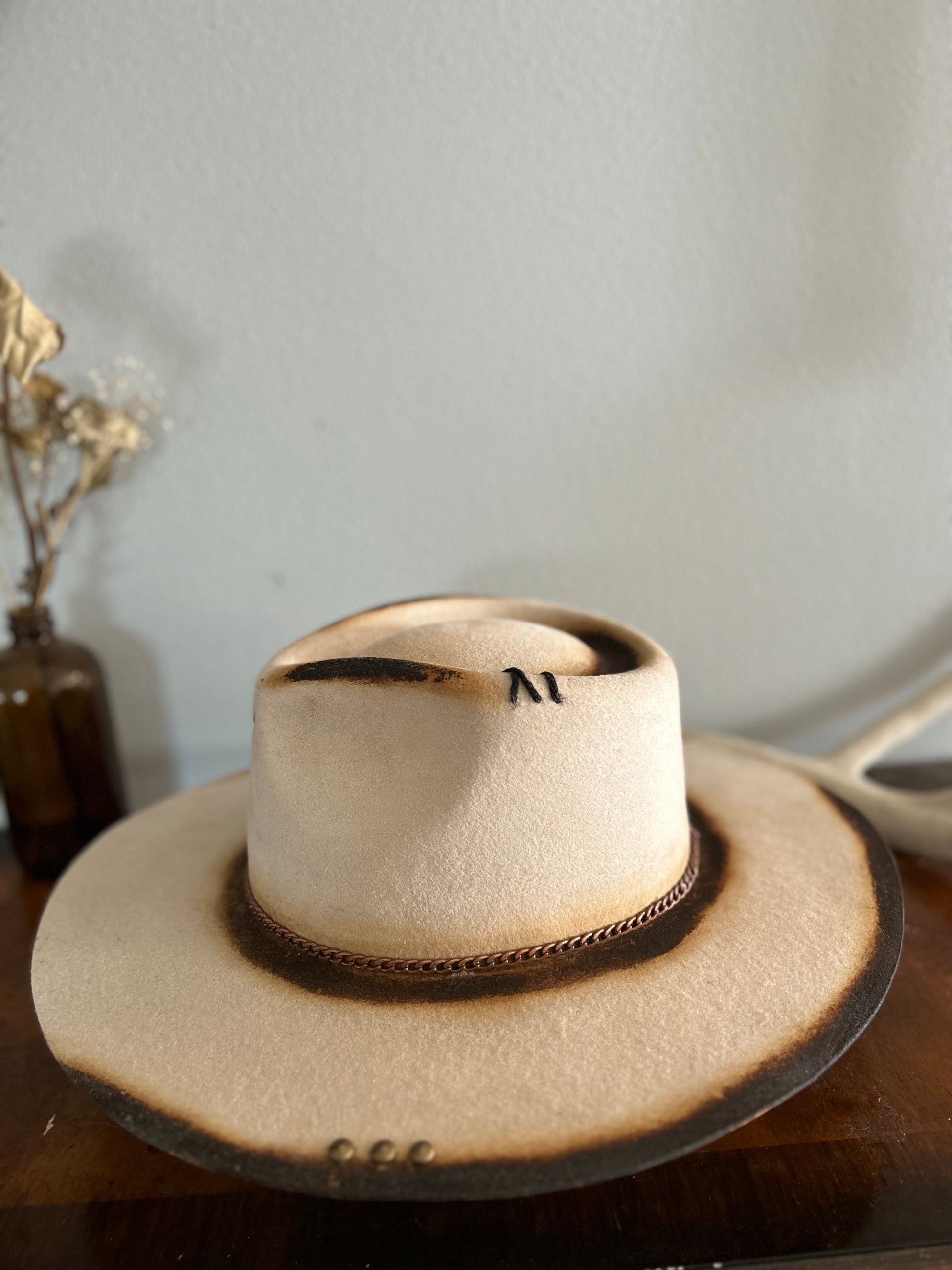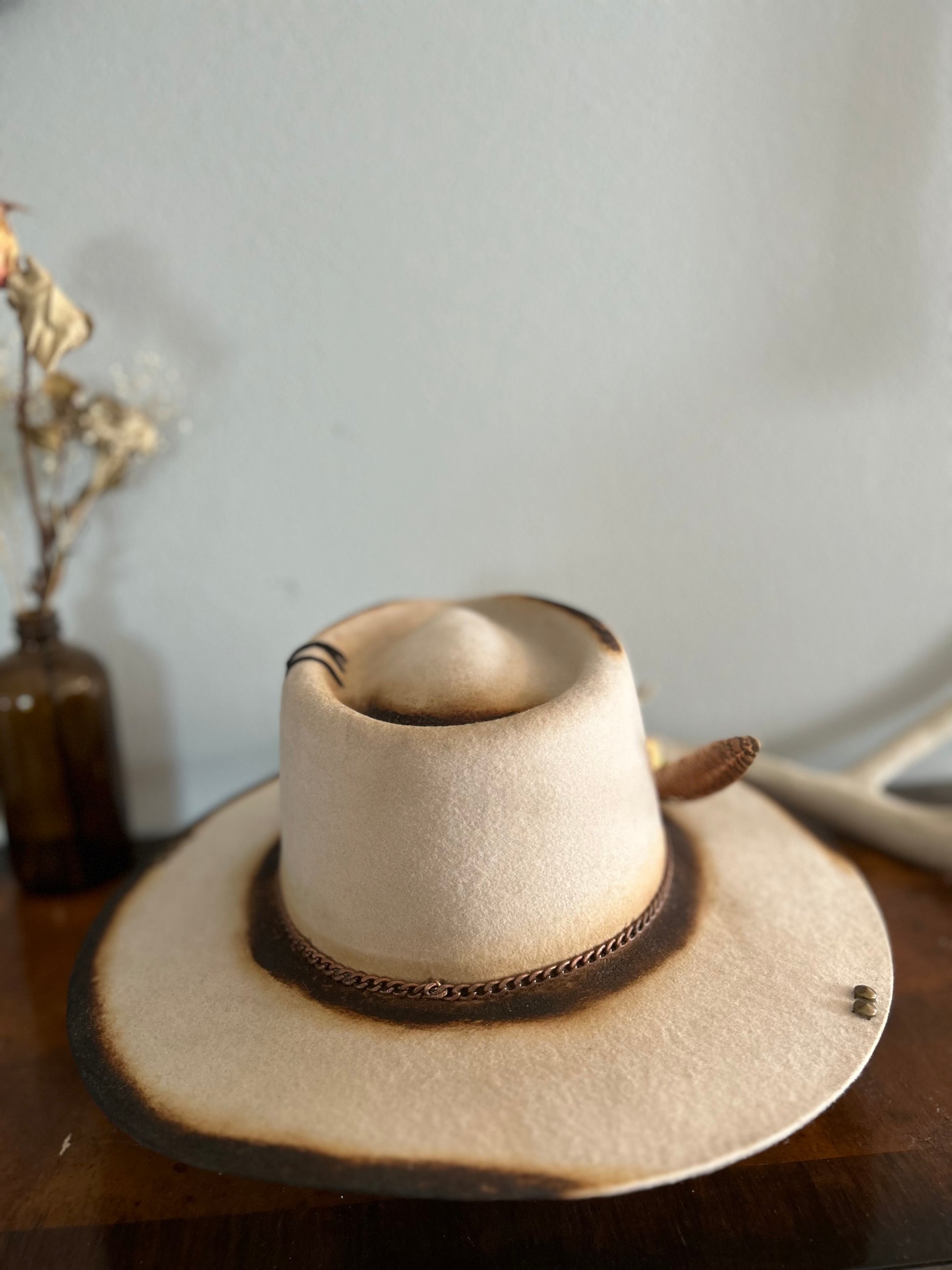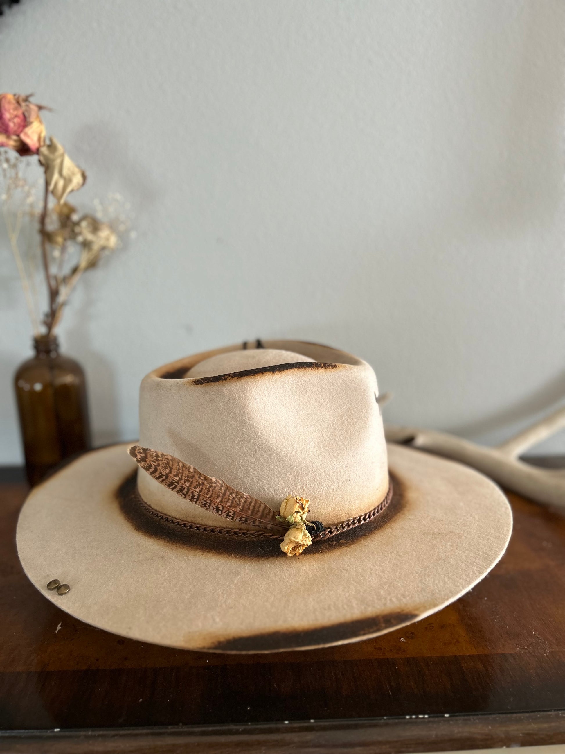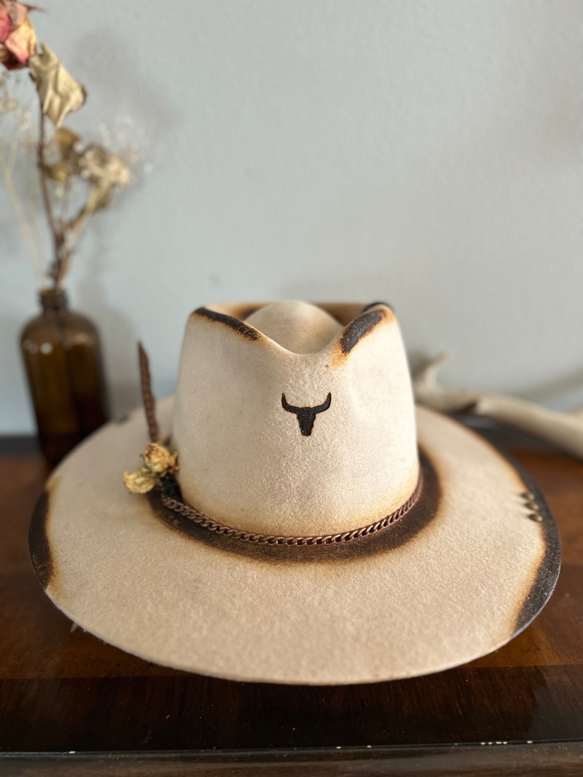 Cream rancher, bull brand, thick copper chain, floral arrangement, burnt embellishments, stitching on crown.