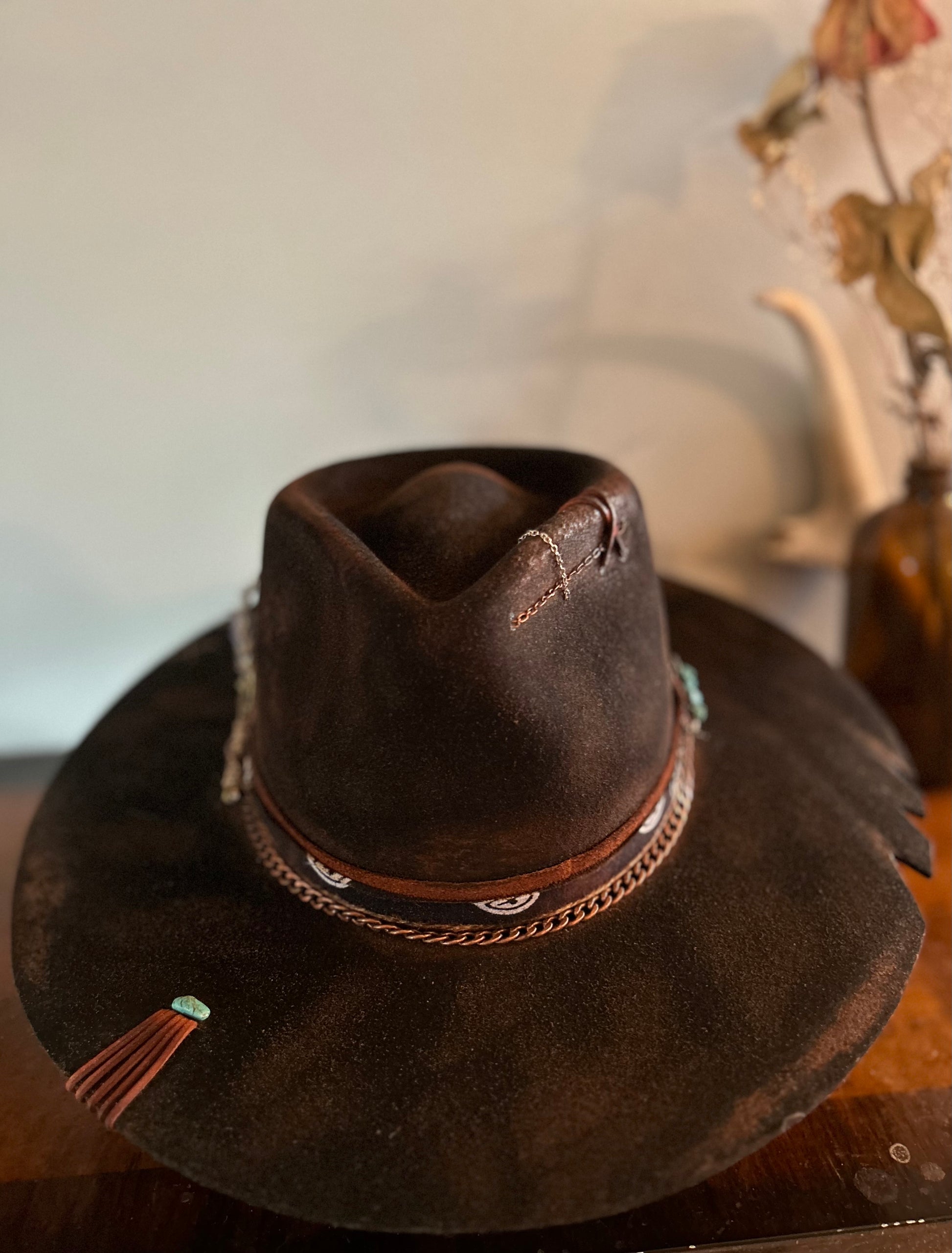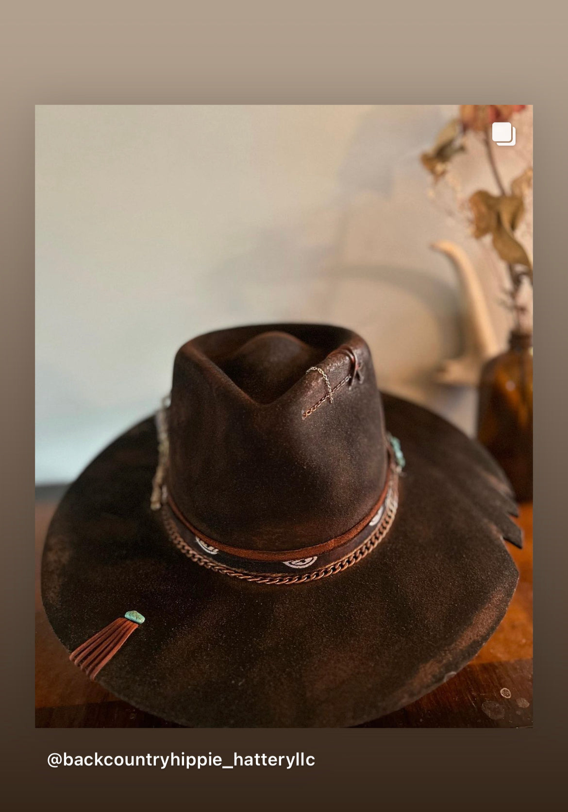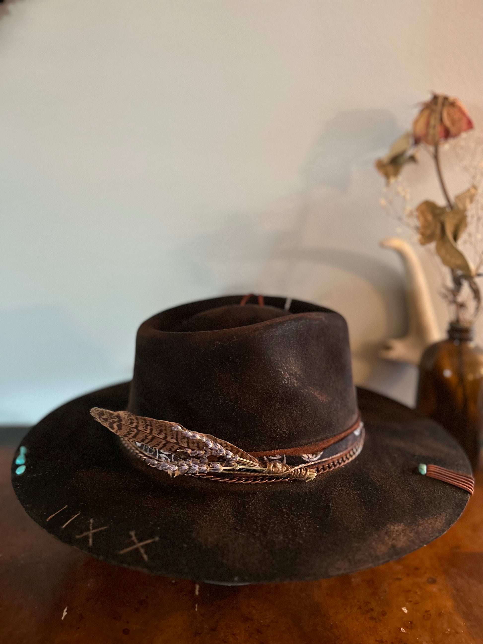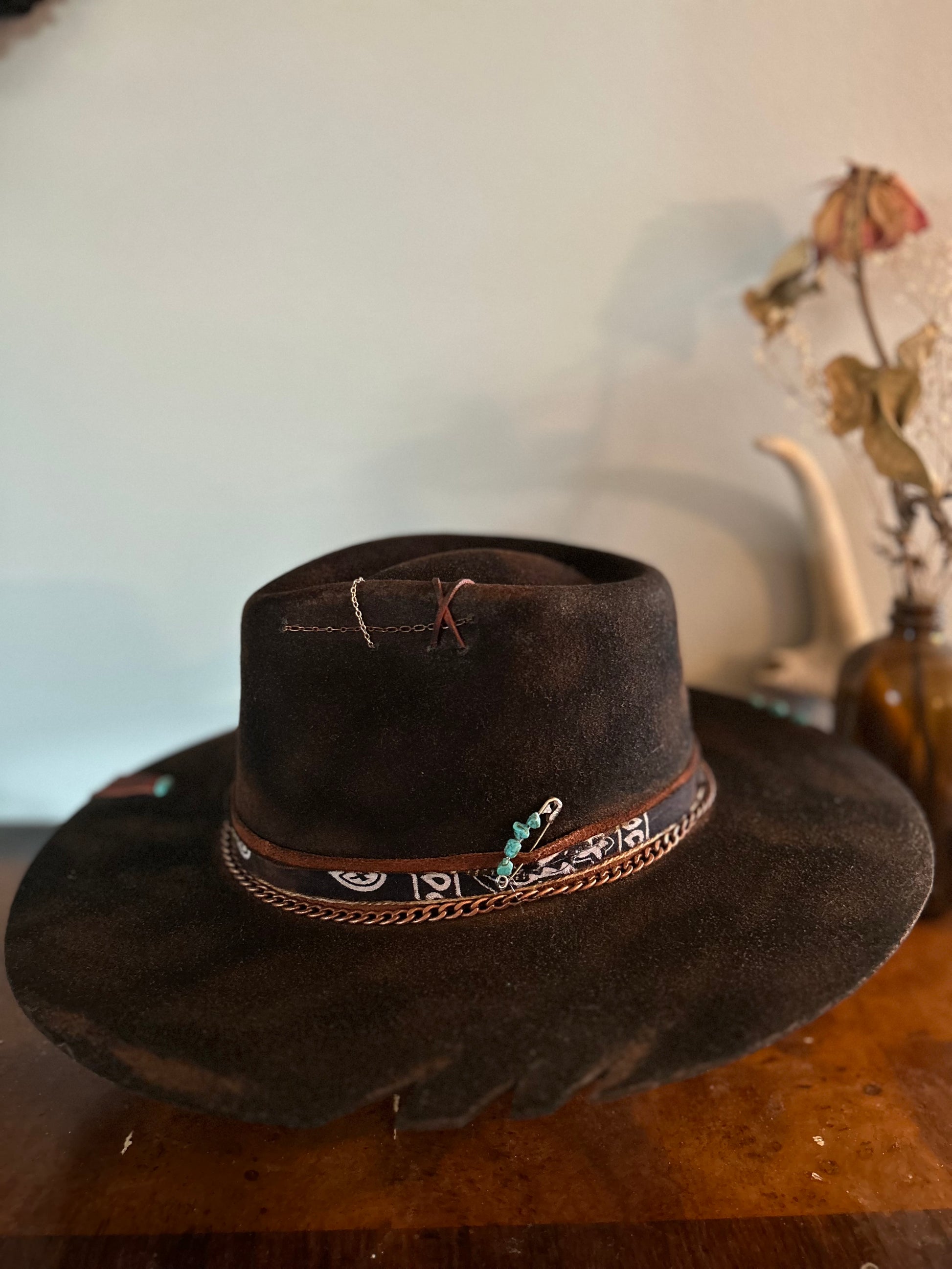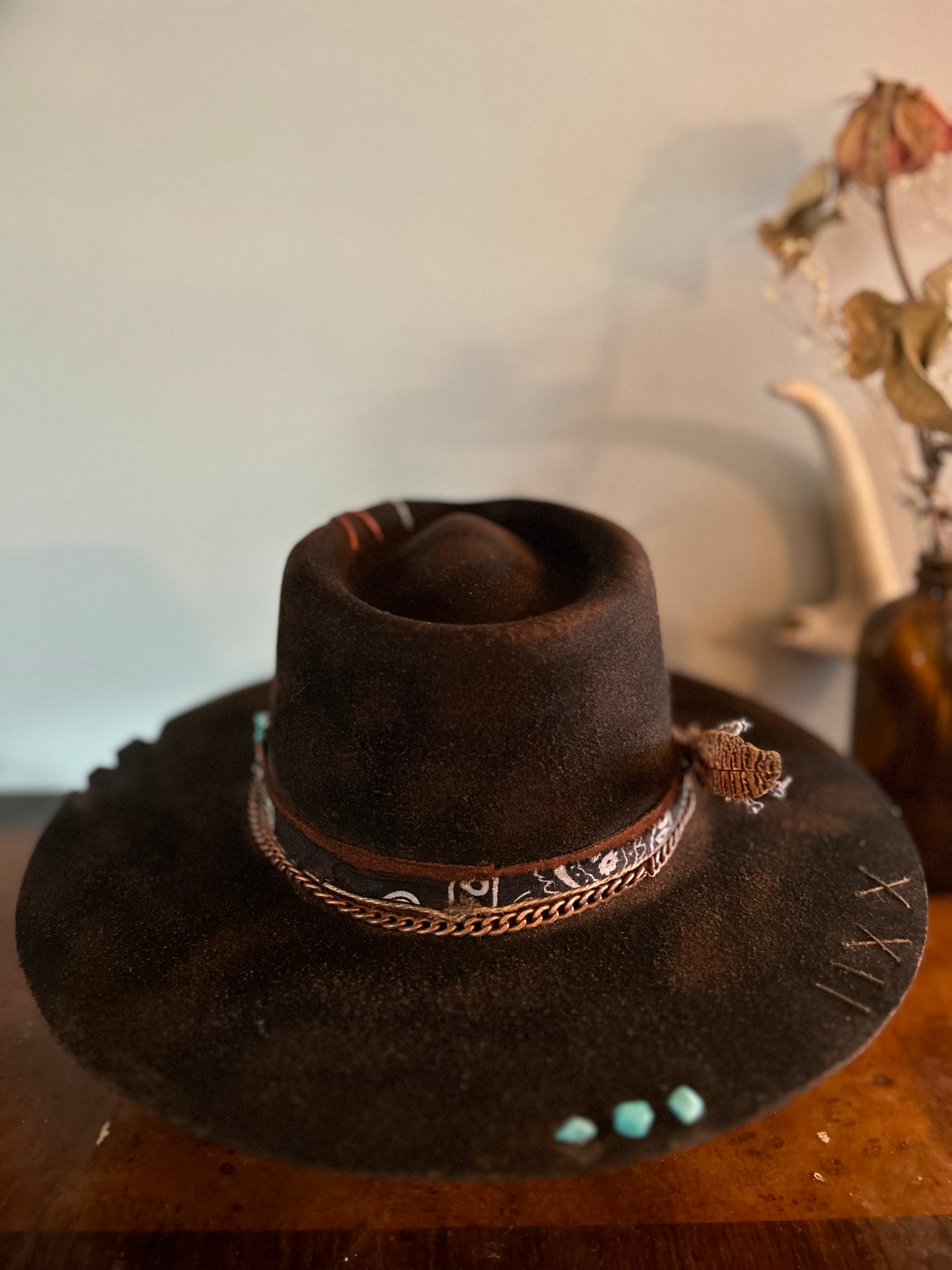 Black rancher, bandana band, copper thick chain, twine, pleather cord embellishments, turquoise pin, feather floral arrangement