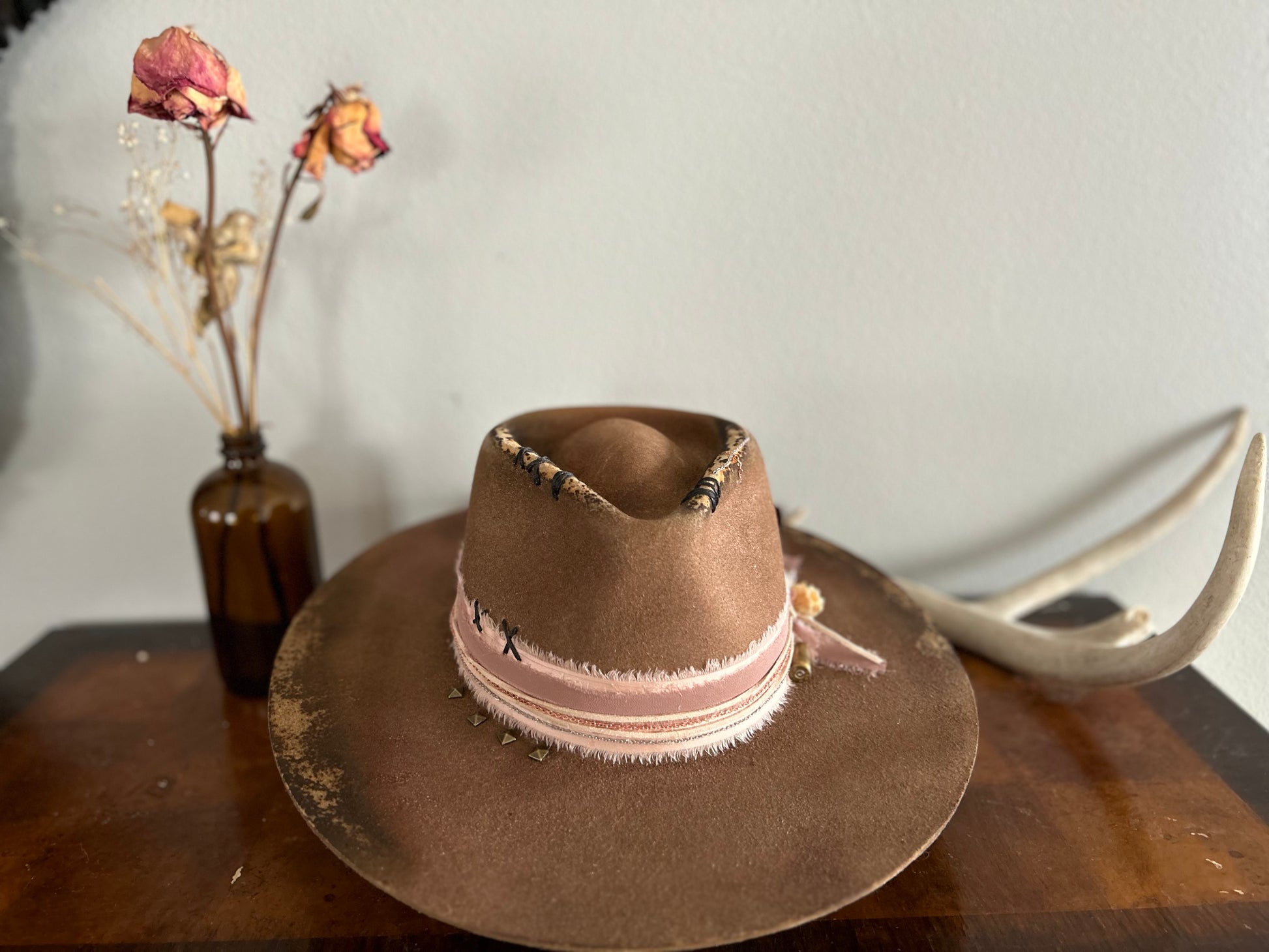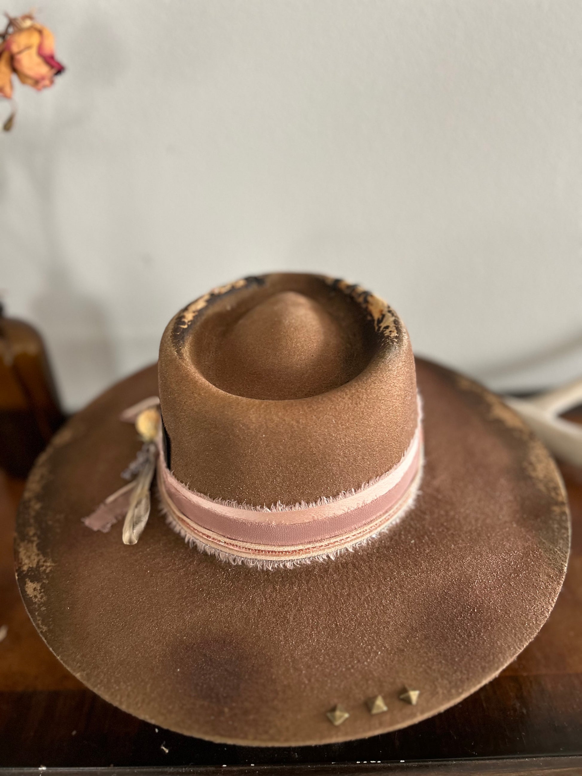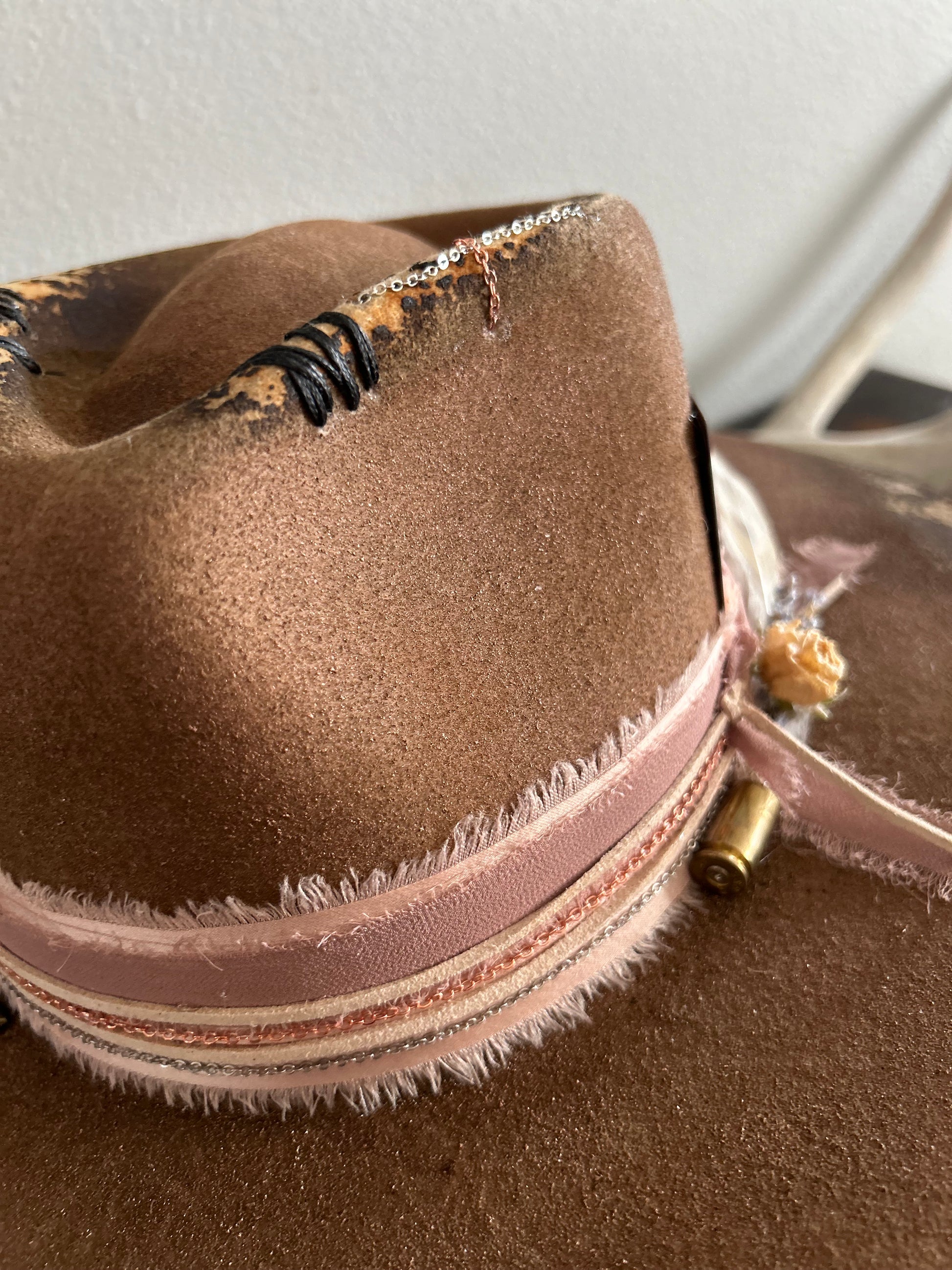 Spray painted gold and rose gold chrome rancher, with dusty rose chiffon ribbon and pink silk ribbon band, distressed, rose gold, silver micro chain, stitching embellishments, and floral/ feather arrangement.