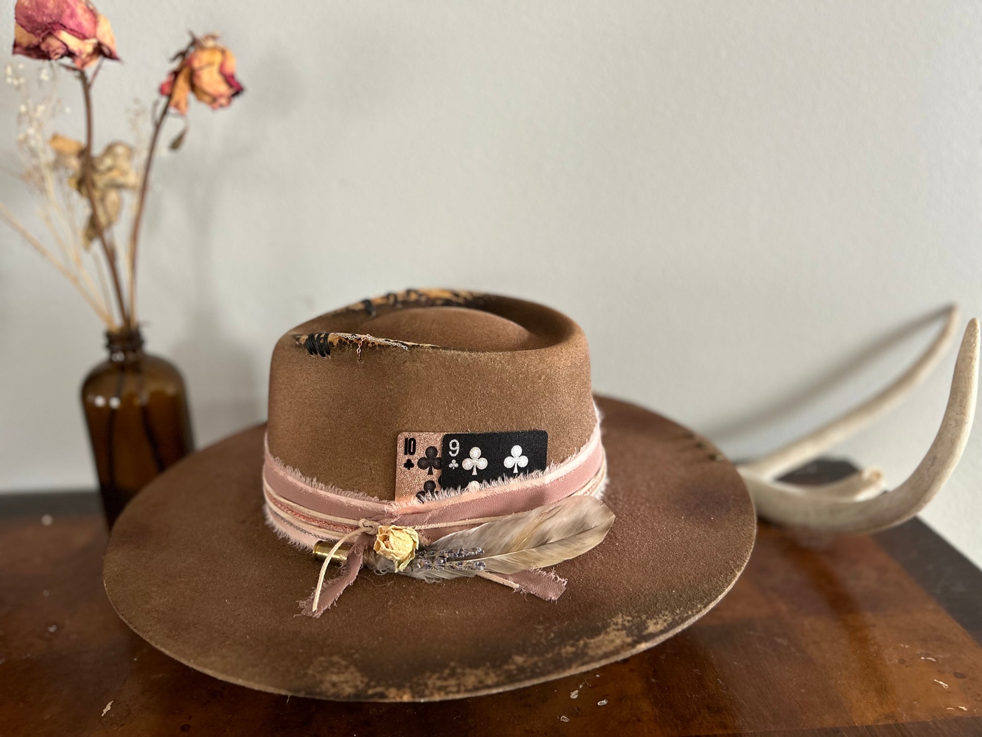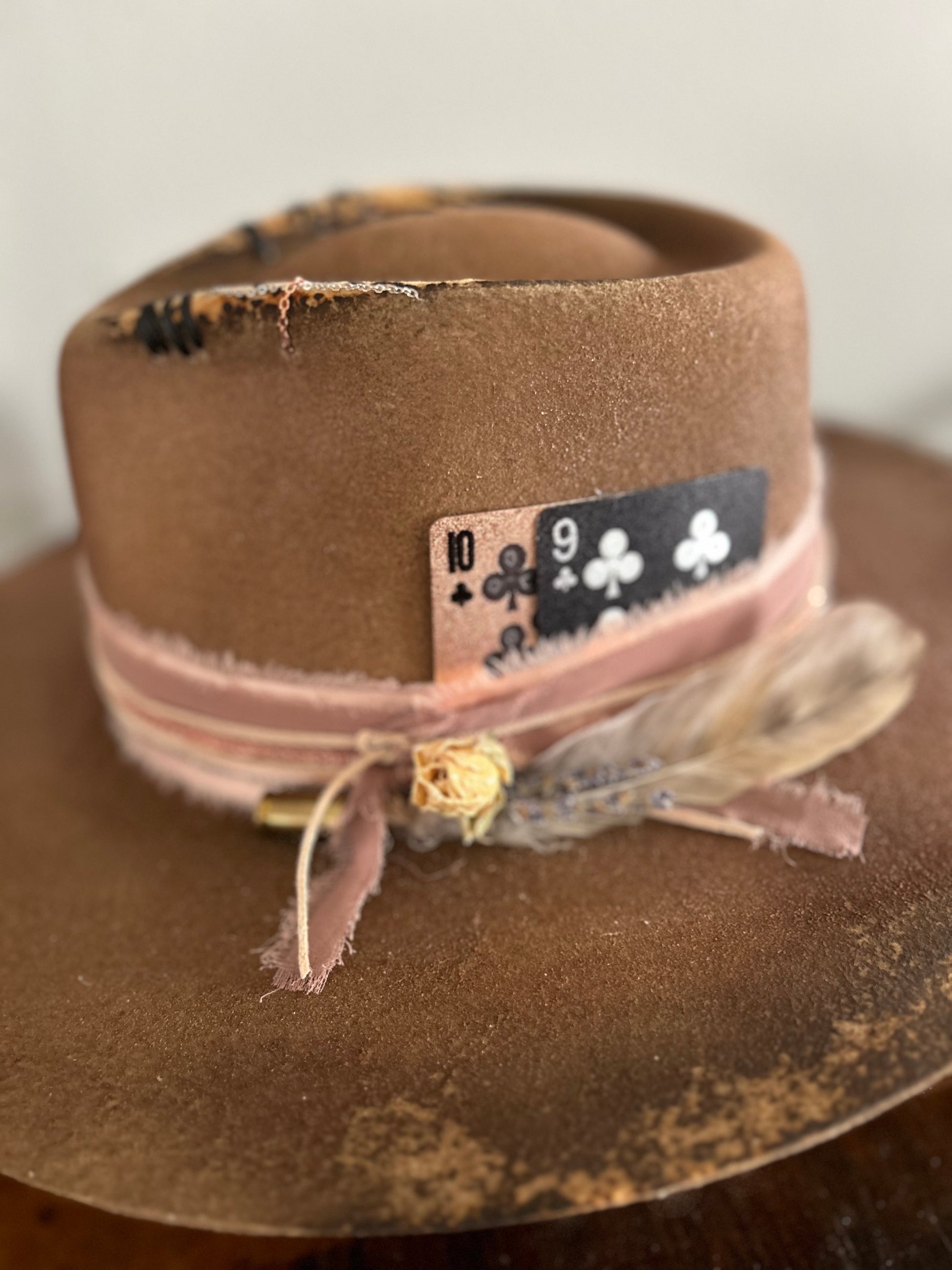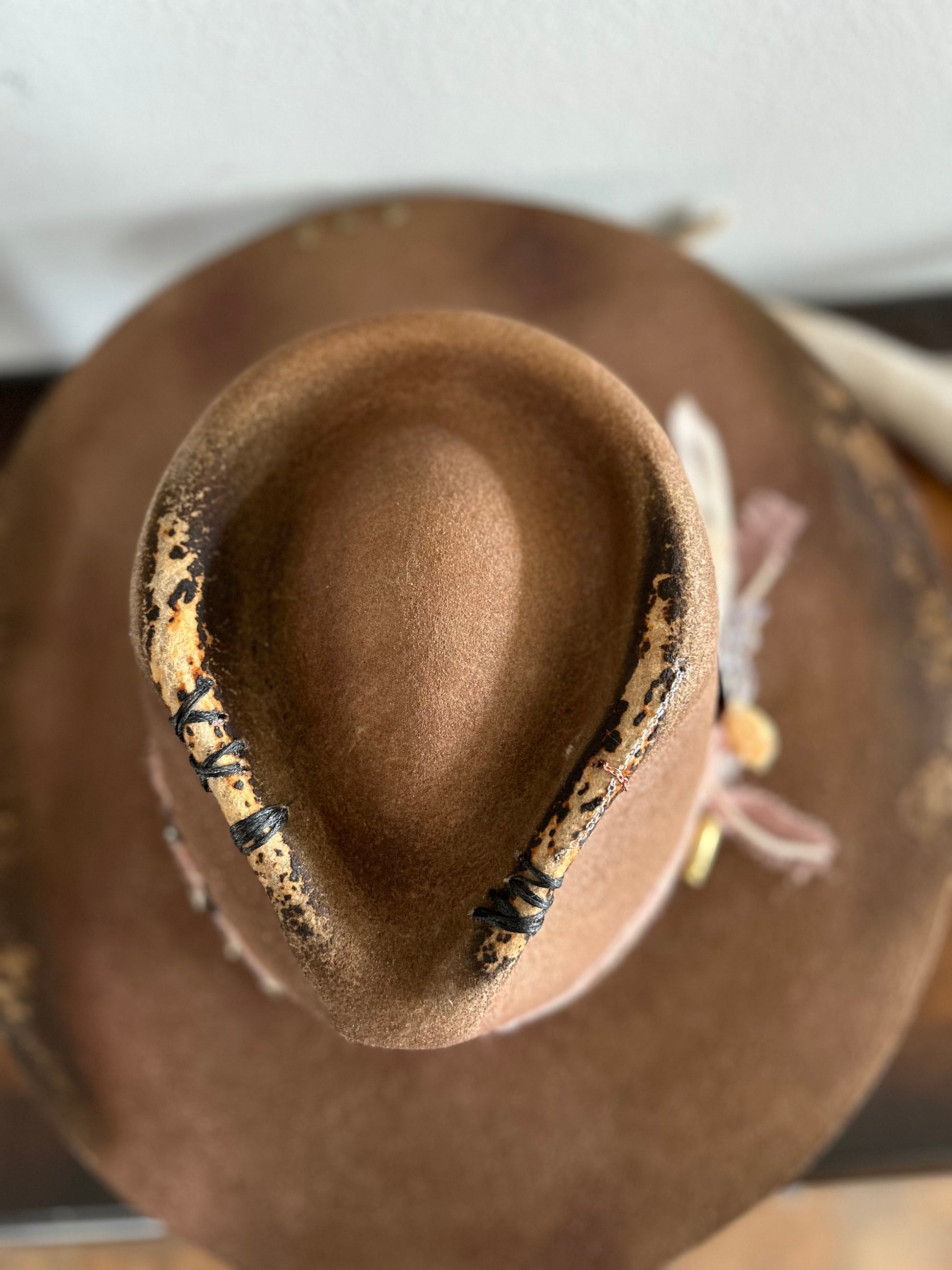 Spray painted gold and rose gold chrome rancher, with dusty rose chiffon ribbon and pink silk ribbon band, distressed, rose gold, silver micro chain, stitching embellishments, and floral/ feather arrangement.