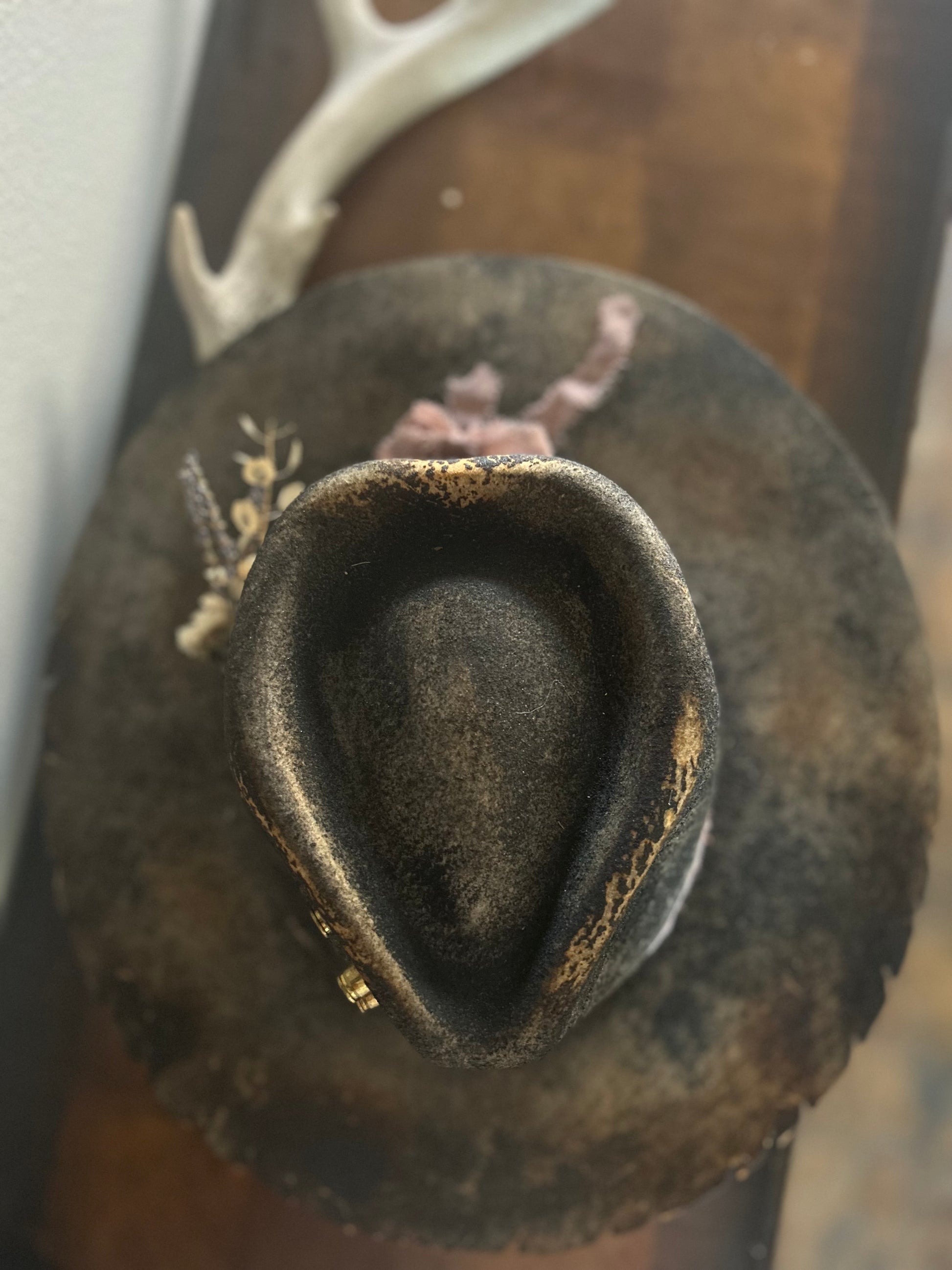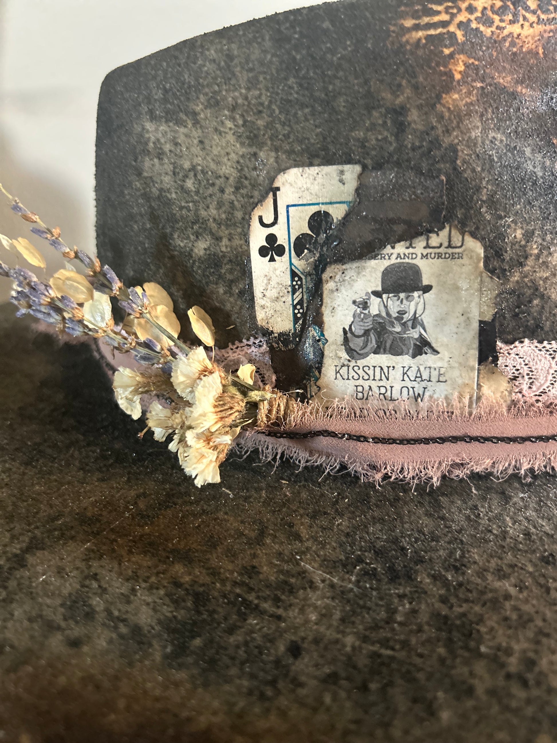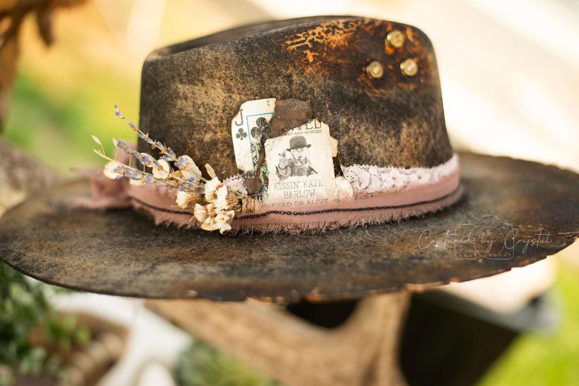 Black spray painted rancher burnt, dusty rose chiffon ribbon, black micro chain, floral arrangement, bullet casings burnt playing card