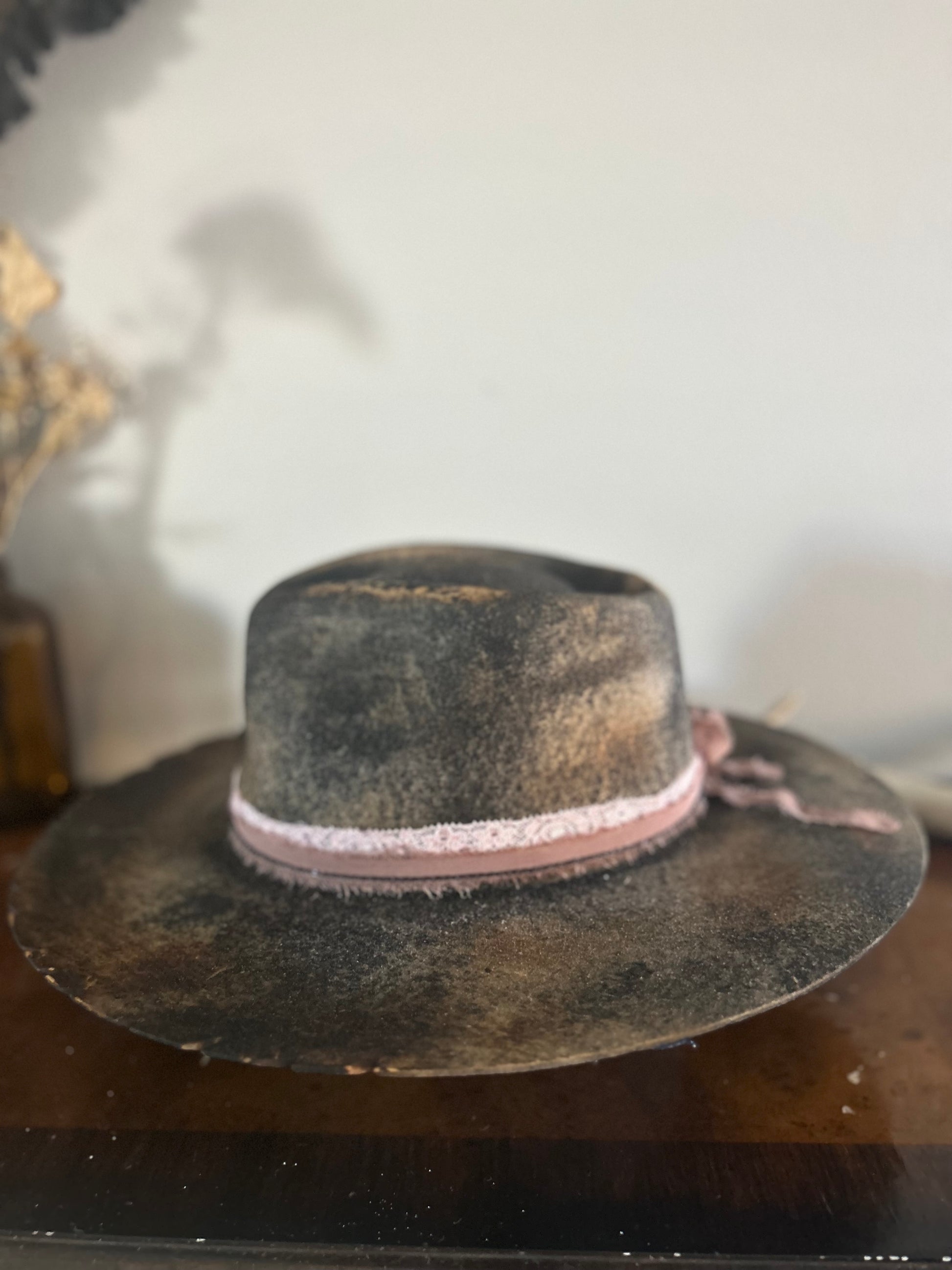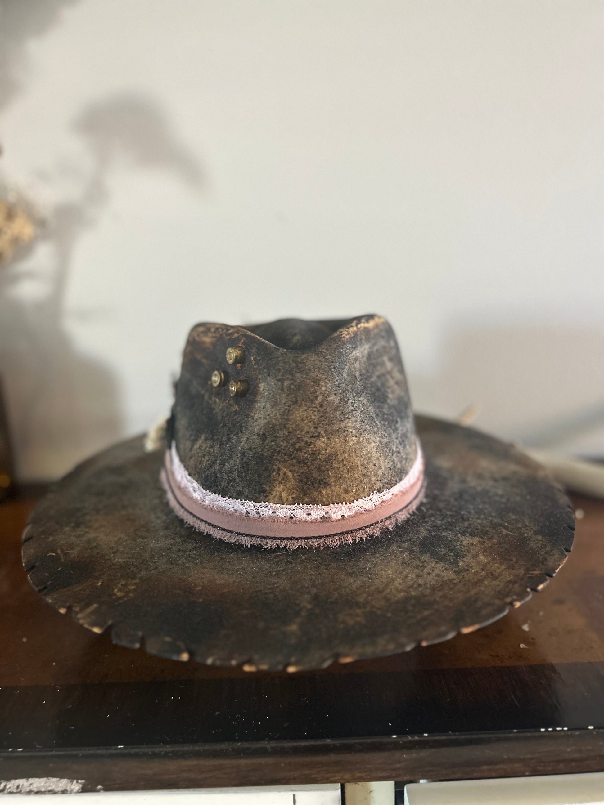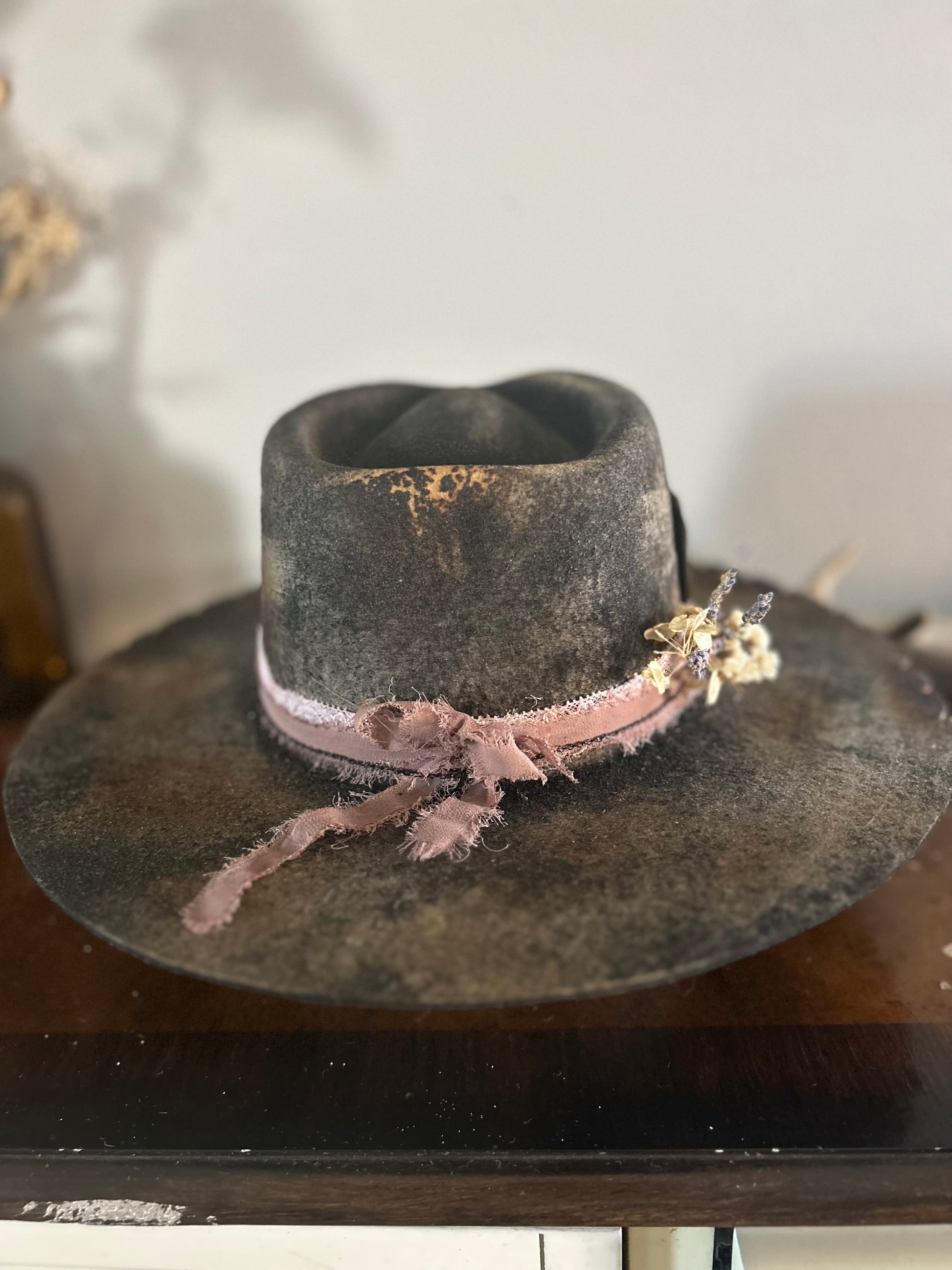 Black spray painted rancher burnt, dusty rose chiffon ribbon, black micro chain, floral arrangement, bullet casings burnt playing card