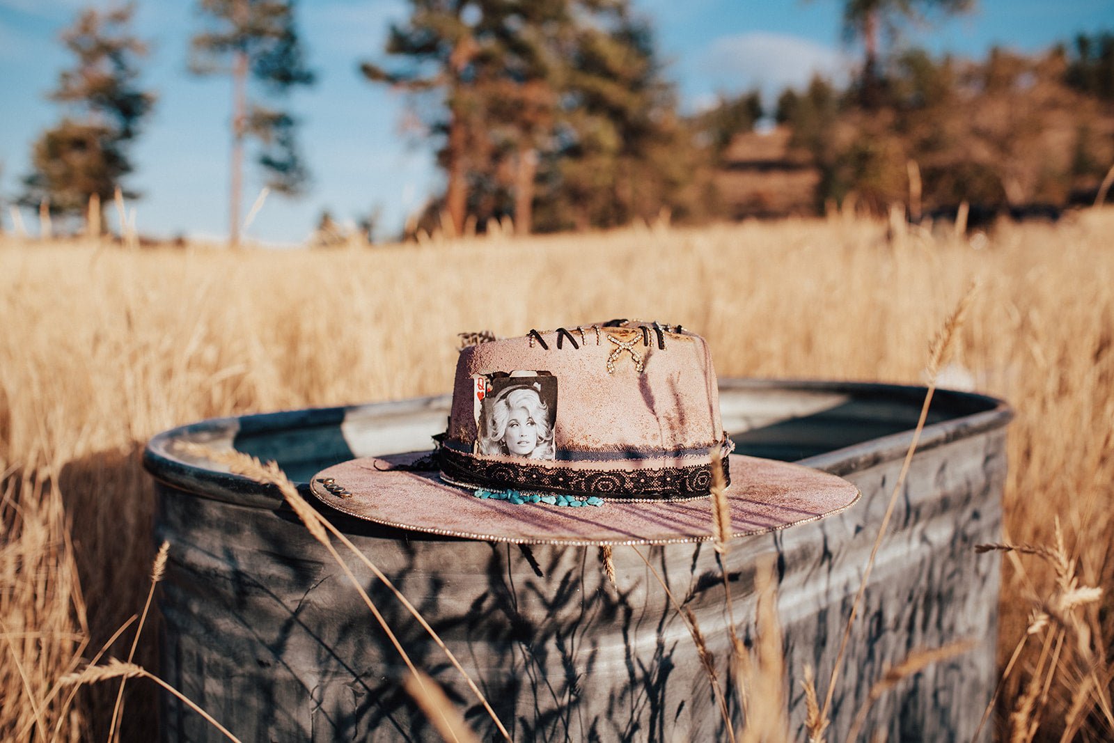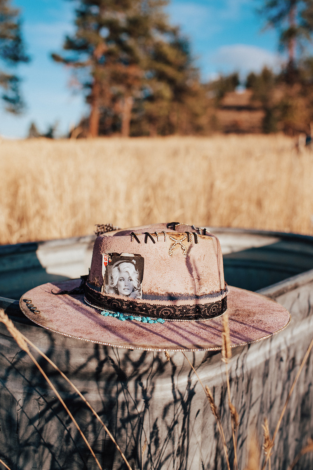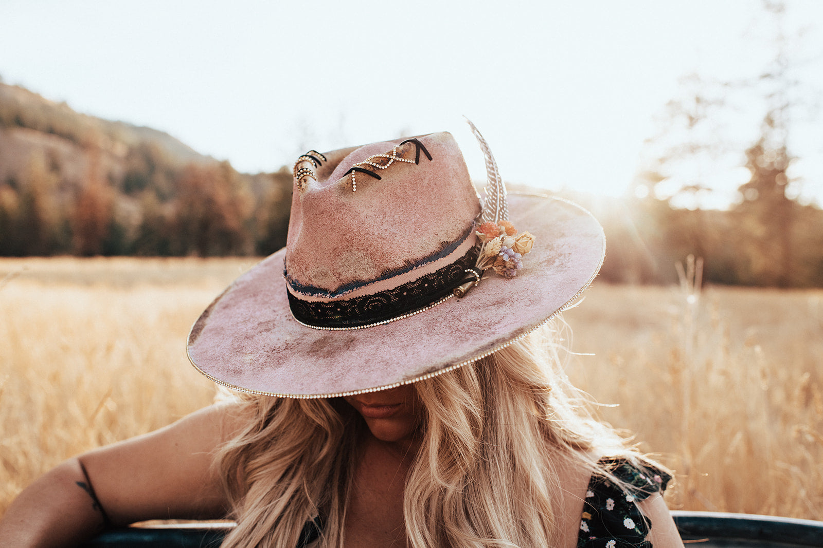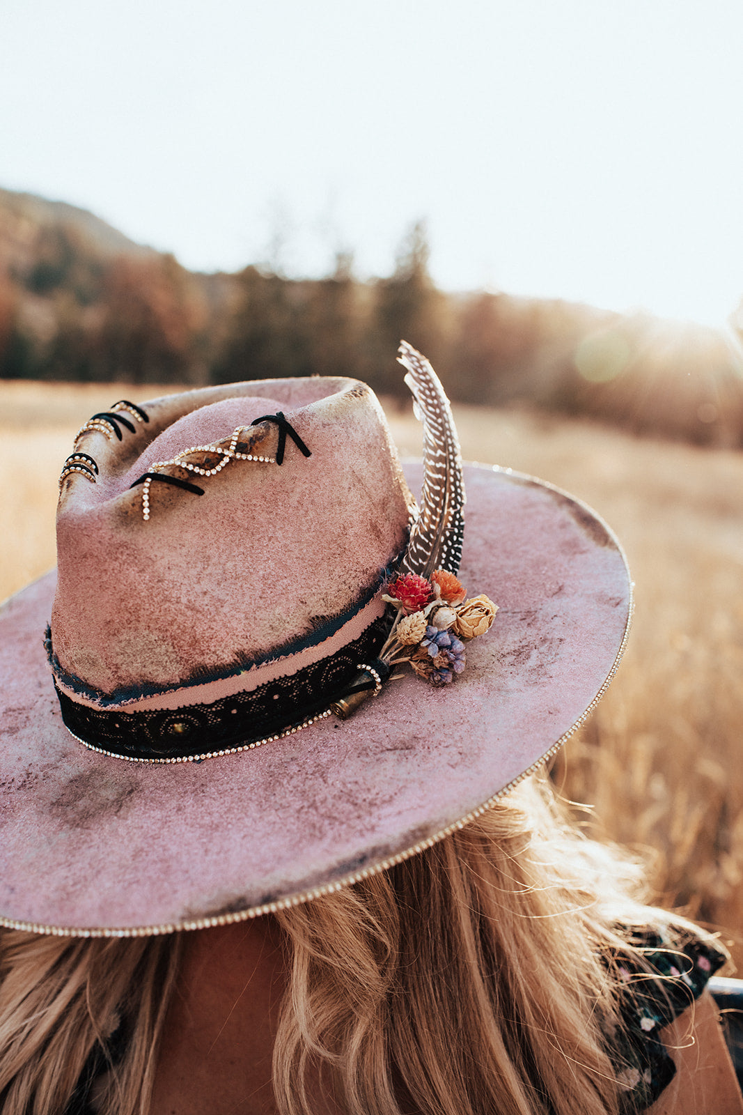 Pink rancher with chiffon band, lace band, with floral and feather arrangement, with leather cord and other embellishments.