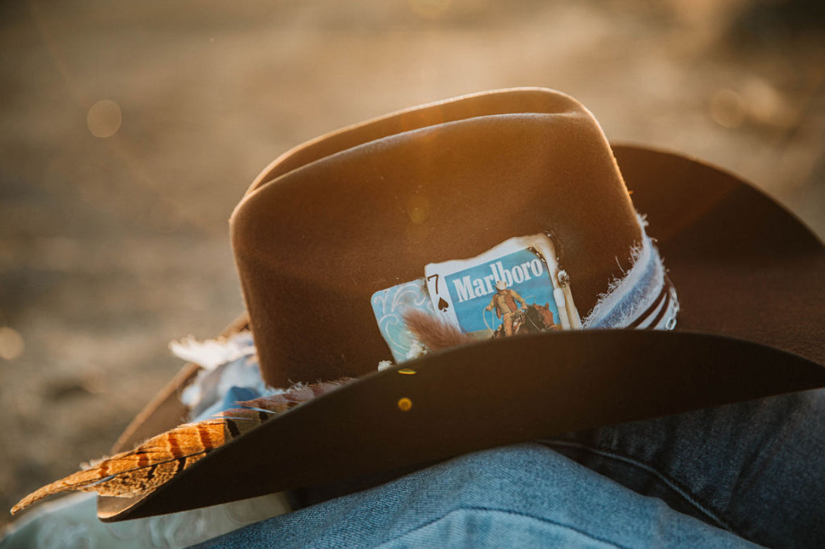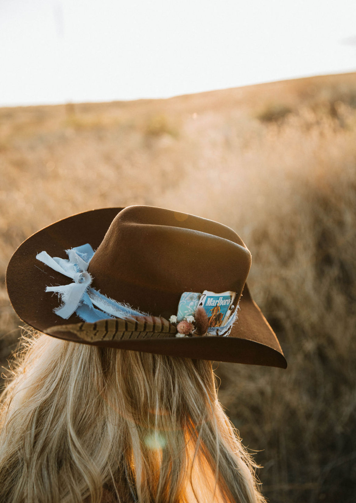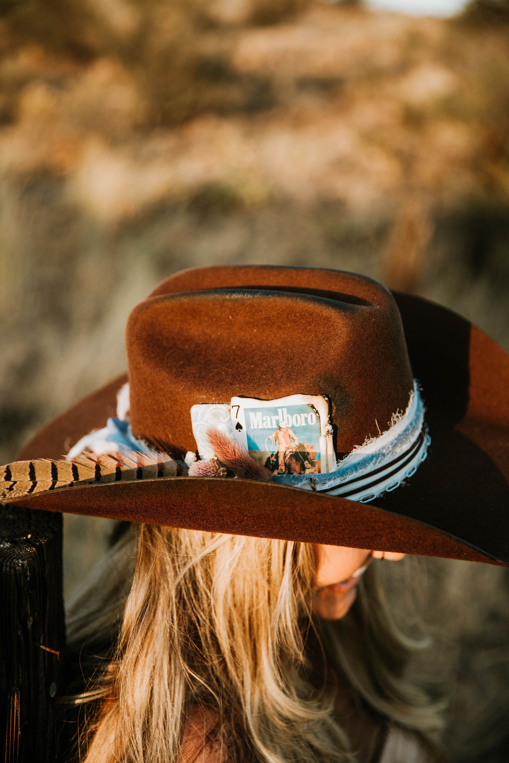 Wool/ felt brown cowboy hat with baby blue and white chiffon ribbon, with paper clip chain, burned playing card, with burns on crown