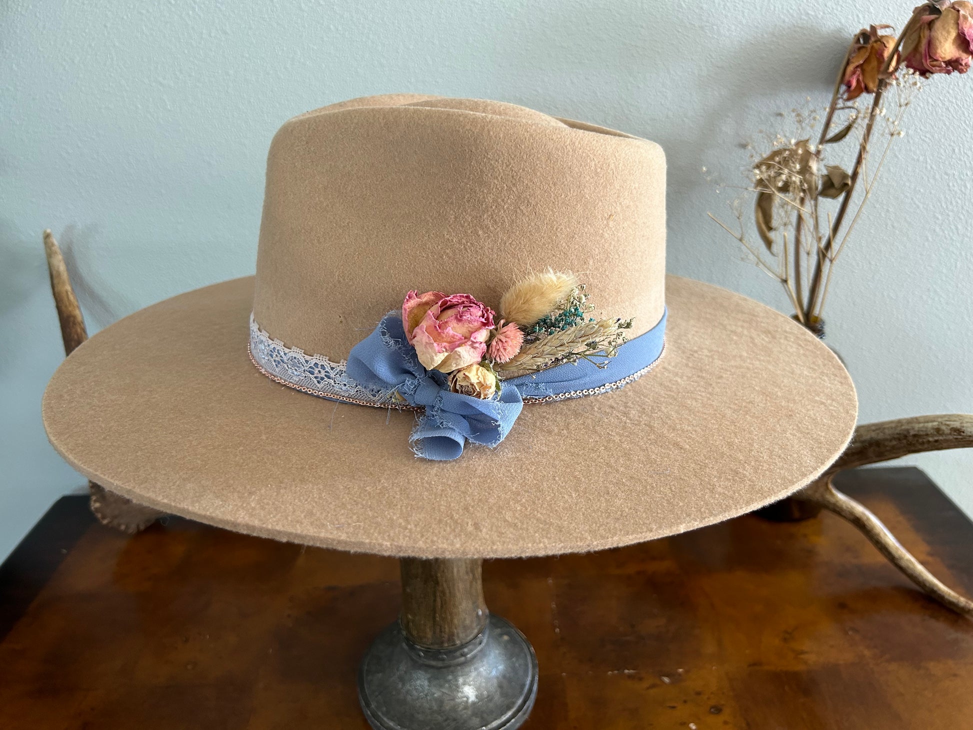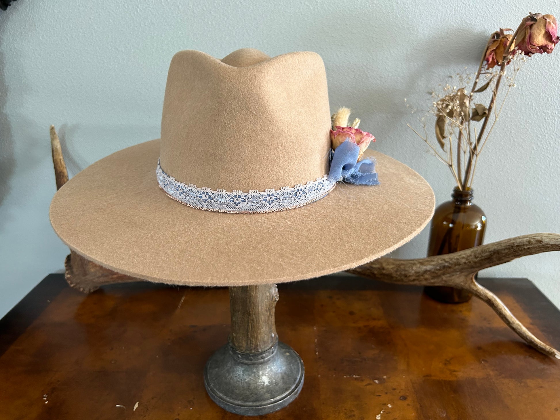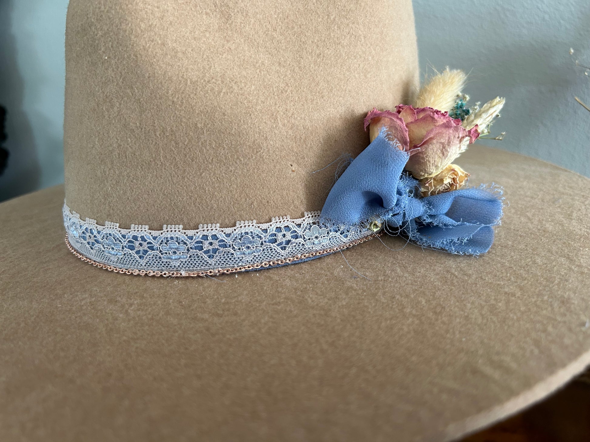 Tan 100% wool rancher with one of a kind light pink vintage lace band with baby blue chiffon ribbon band, rose gold micro chain, floral arrangement