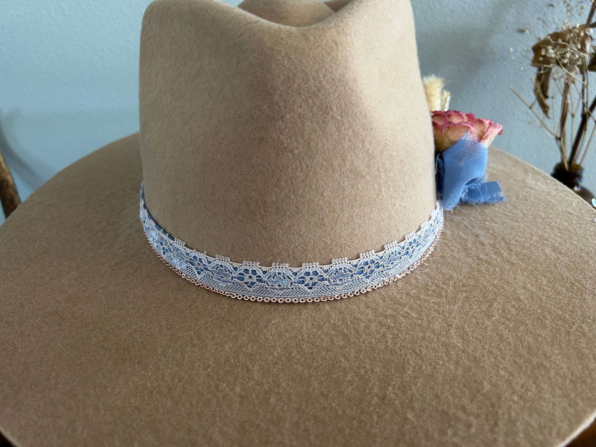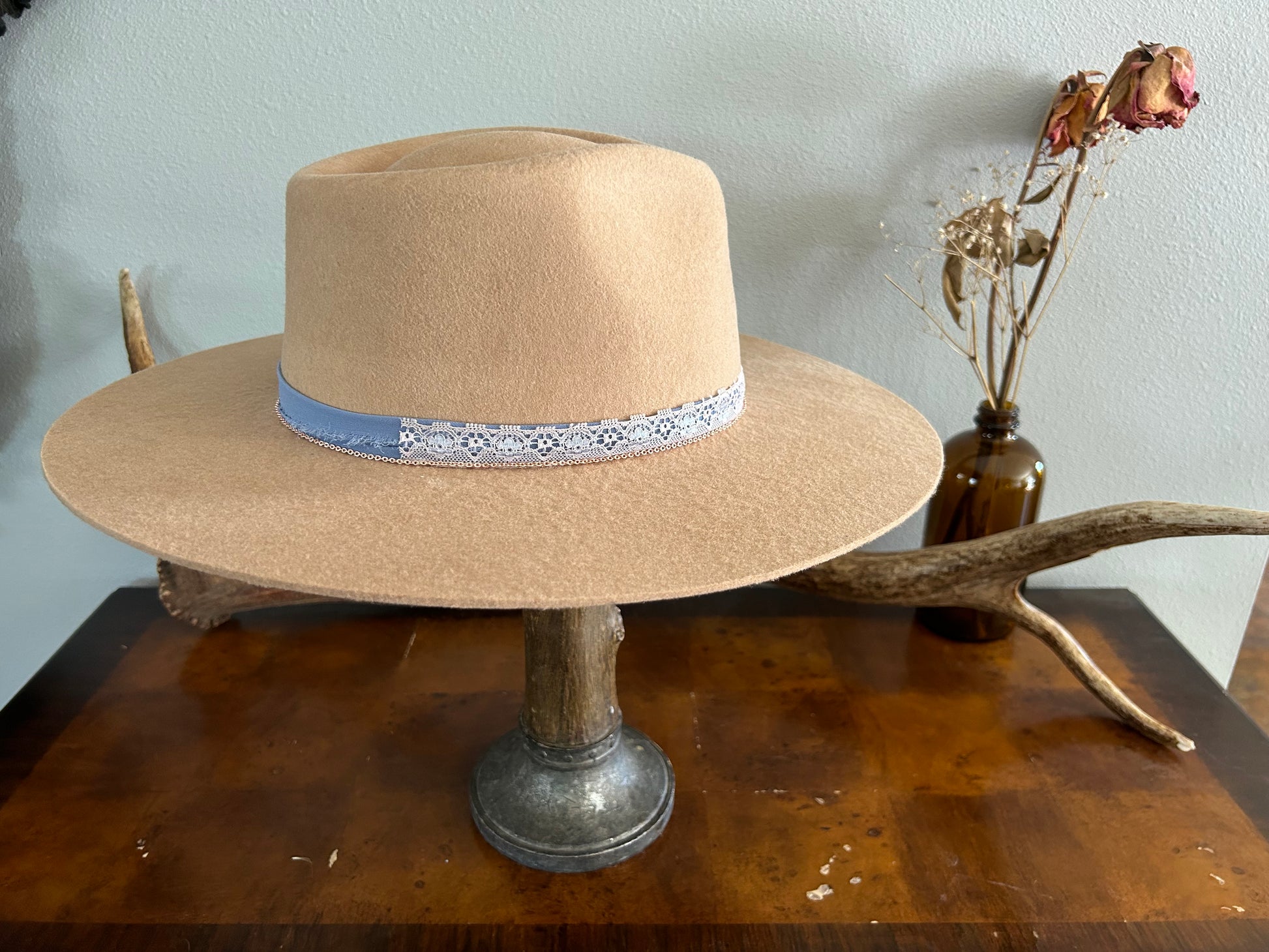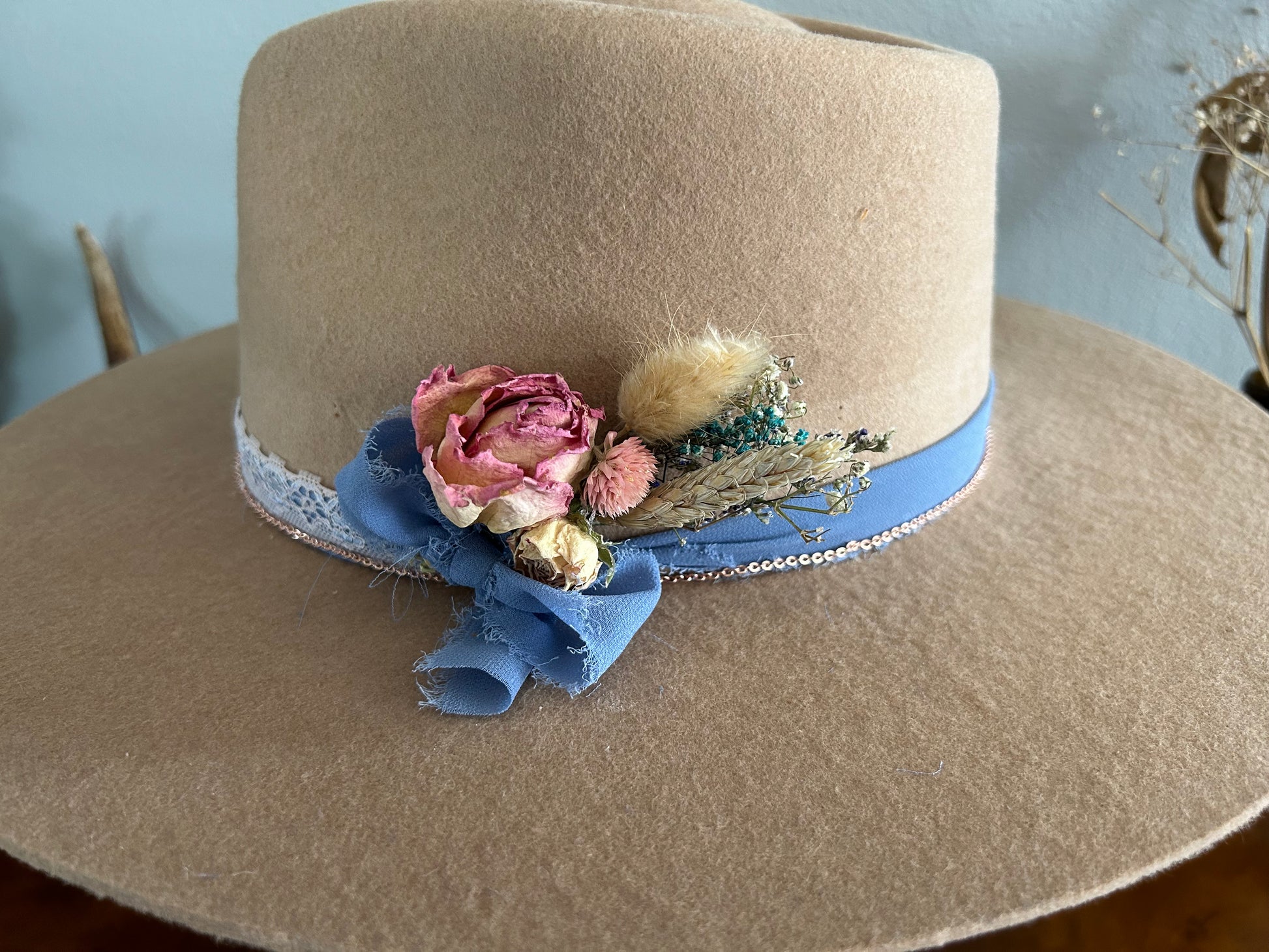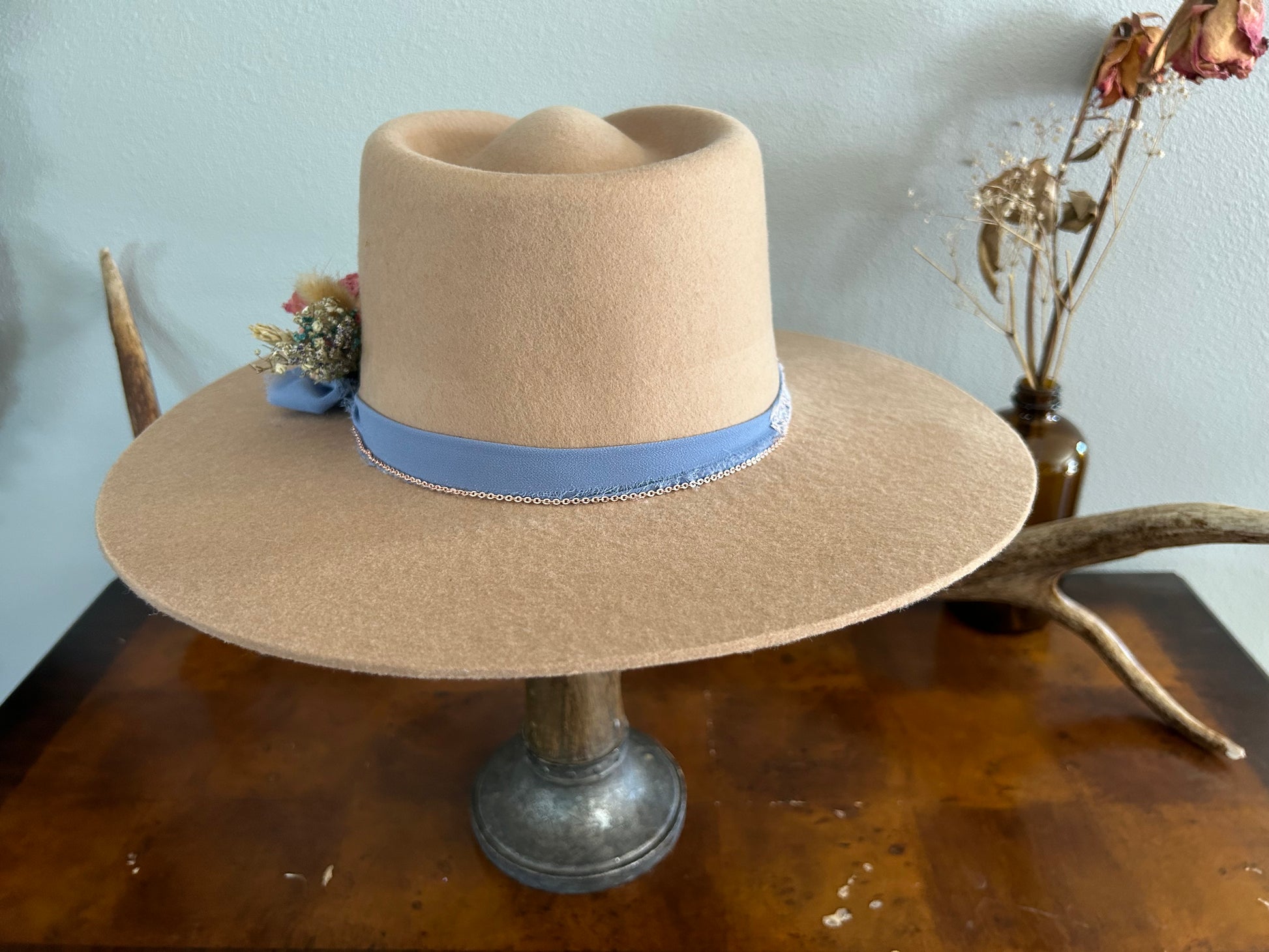 Tan 100% wool rancher with one of a kind light pink vintage lace band with baby blue chiffon ribbon band, rose gold micro chain, floral arrangement