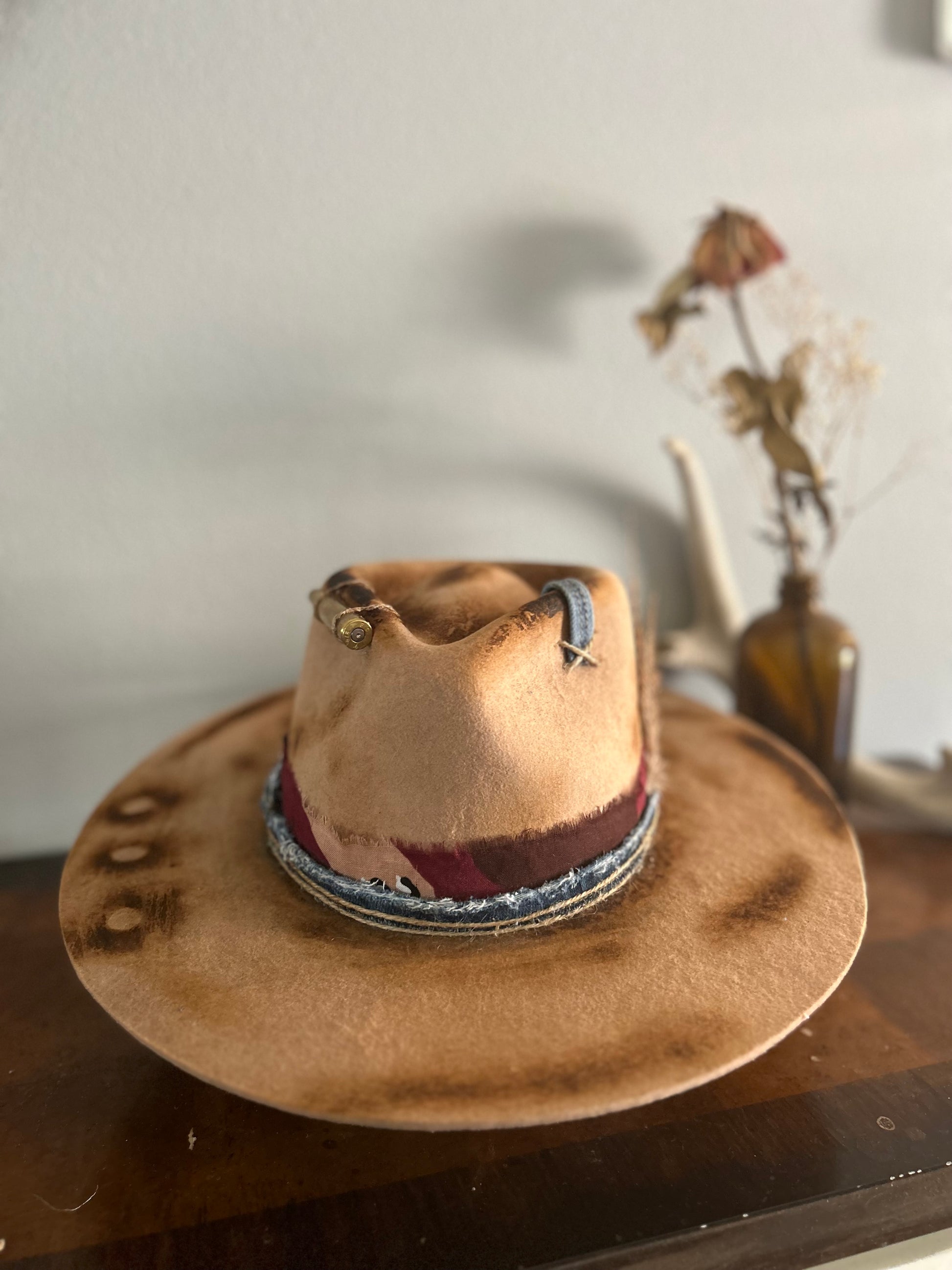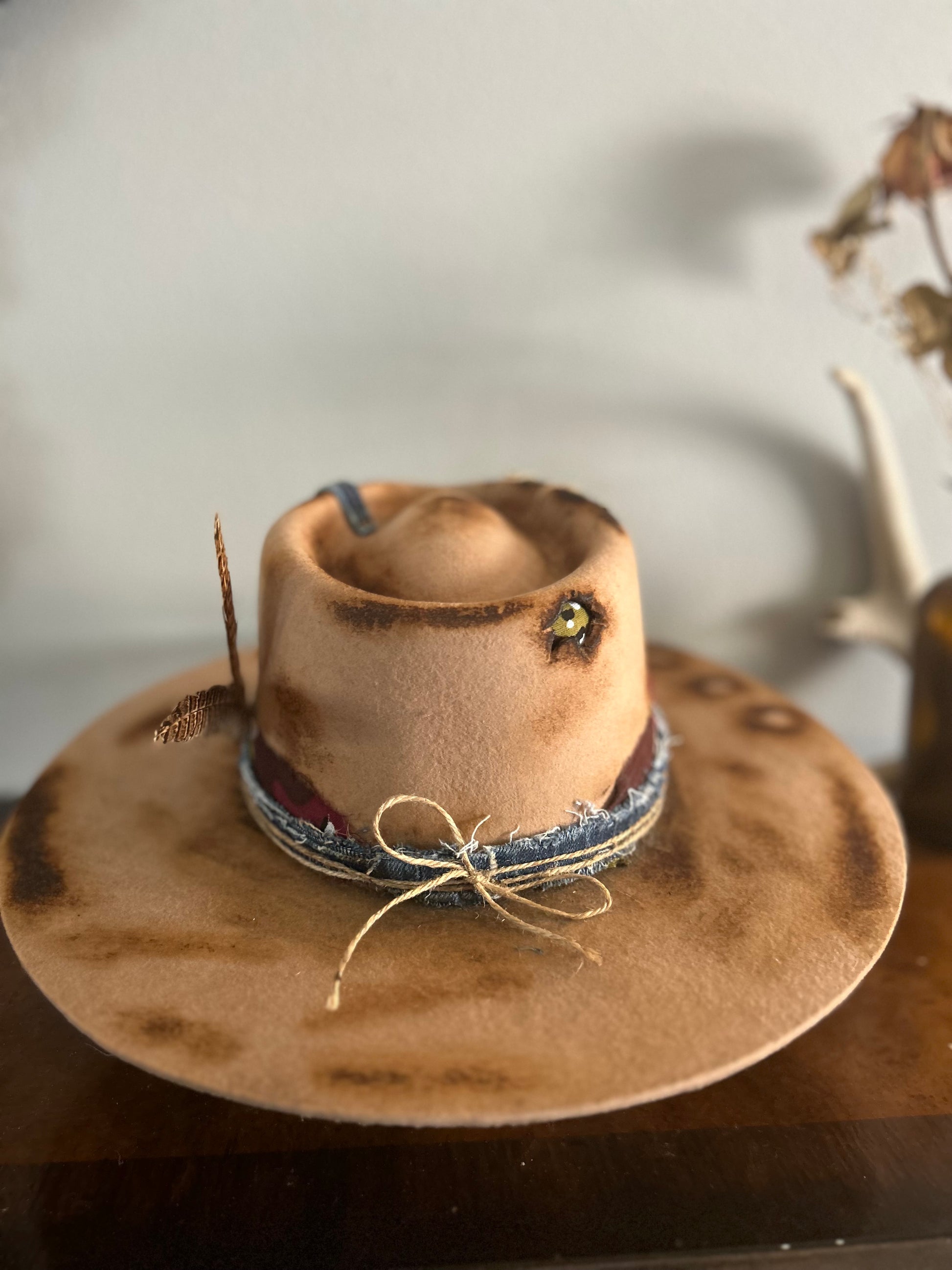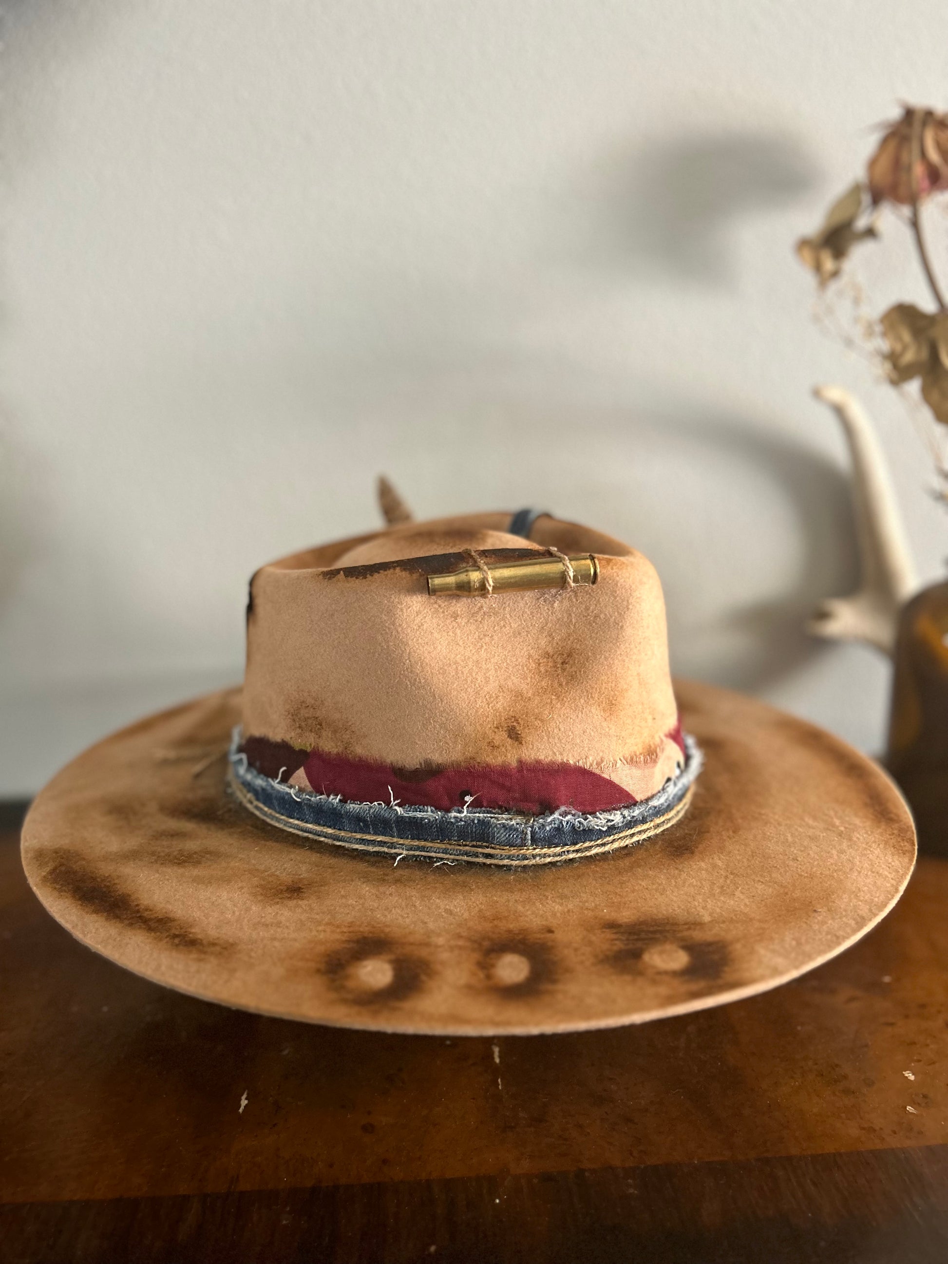 Tan rancher with denim band, bandana band, twine embellishments, bullet casing, feathers, burnt