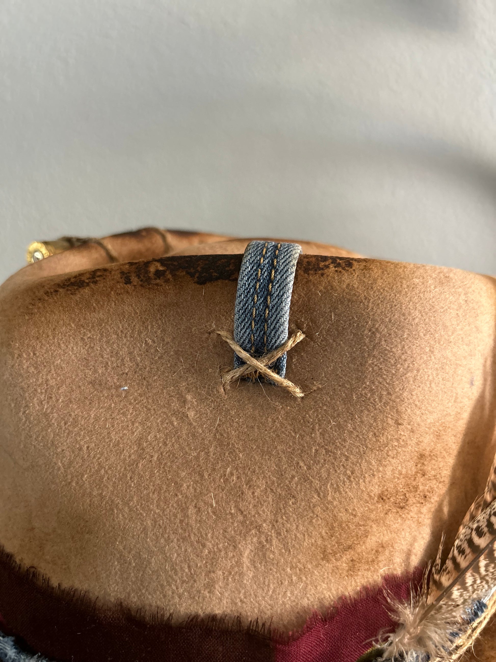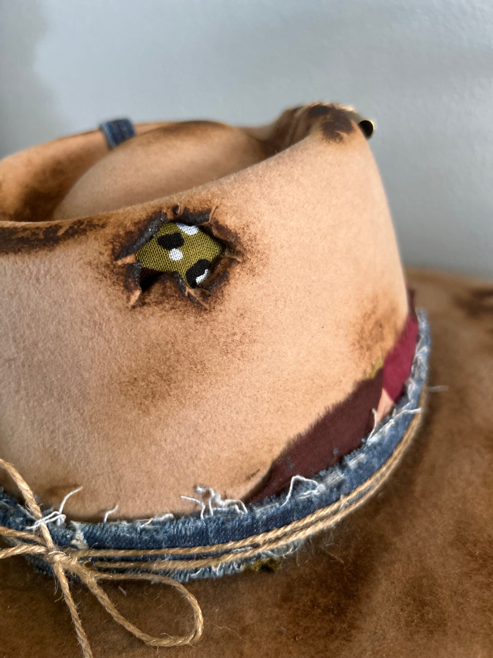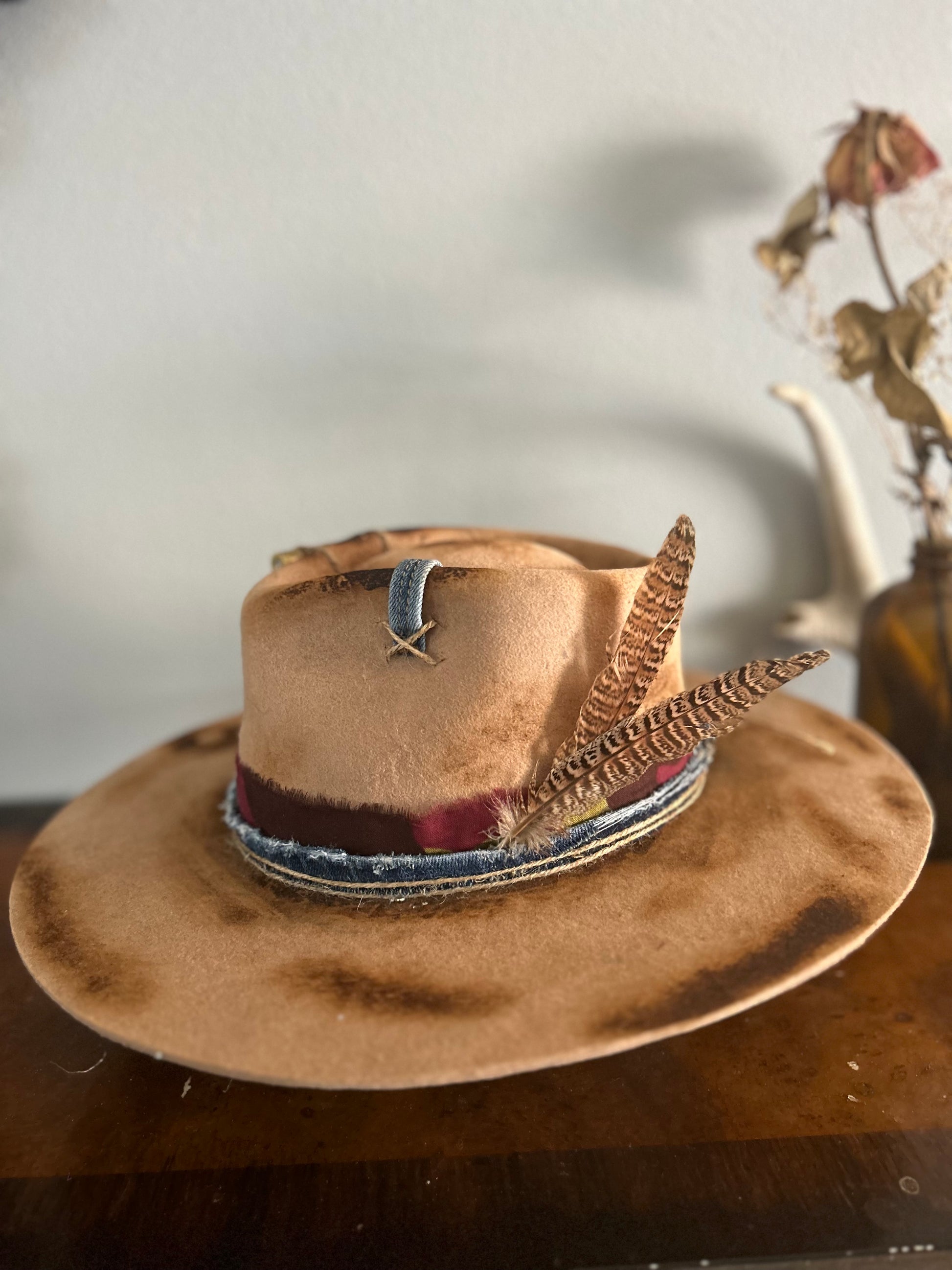 Tan rancher with denim band, bandana band, twine embellishments, bullet casing, feathers, burnt