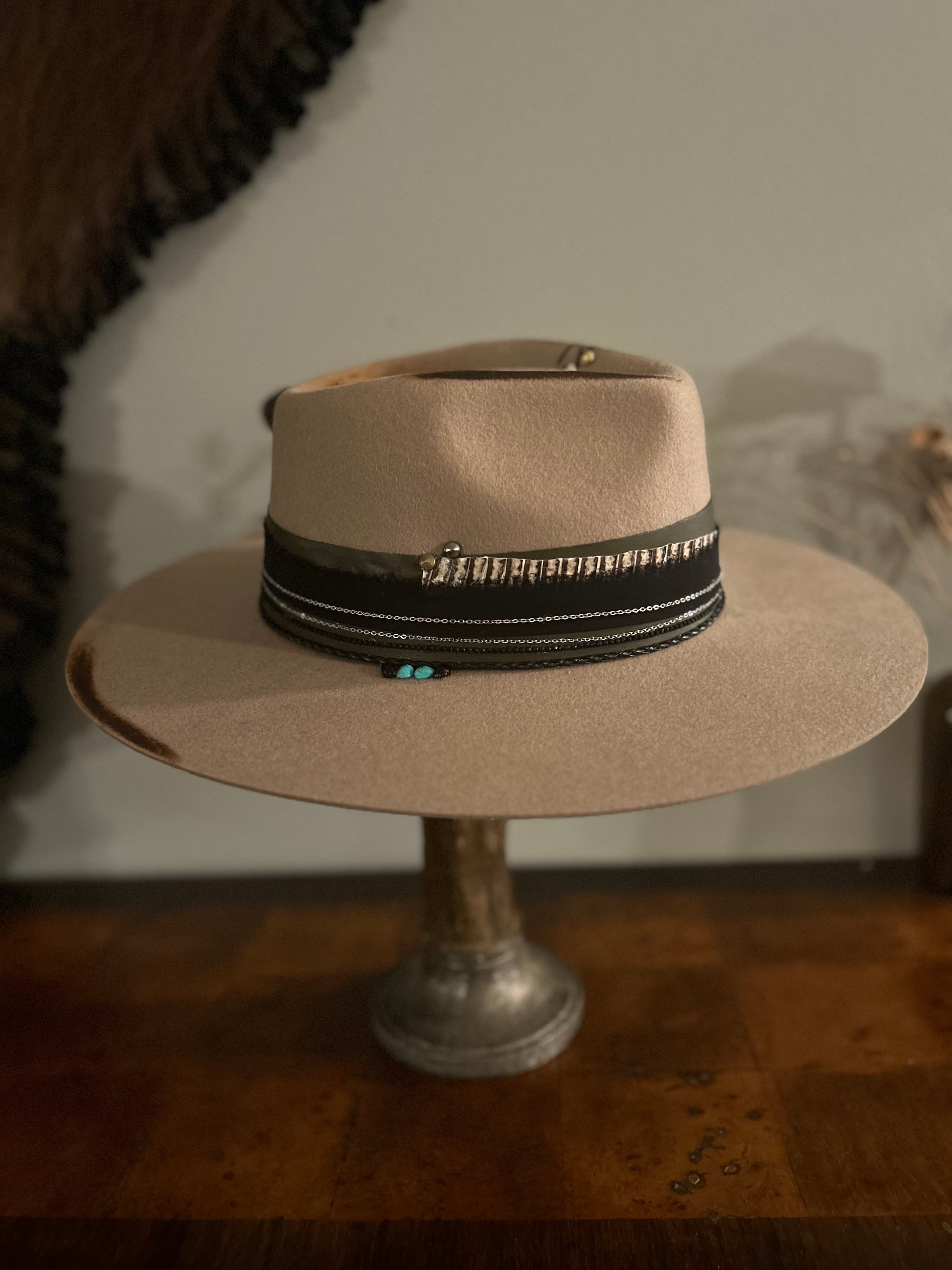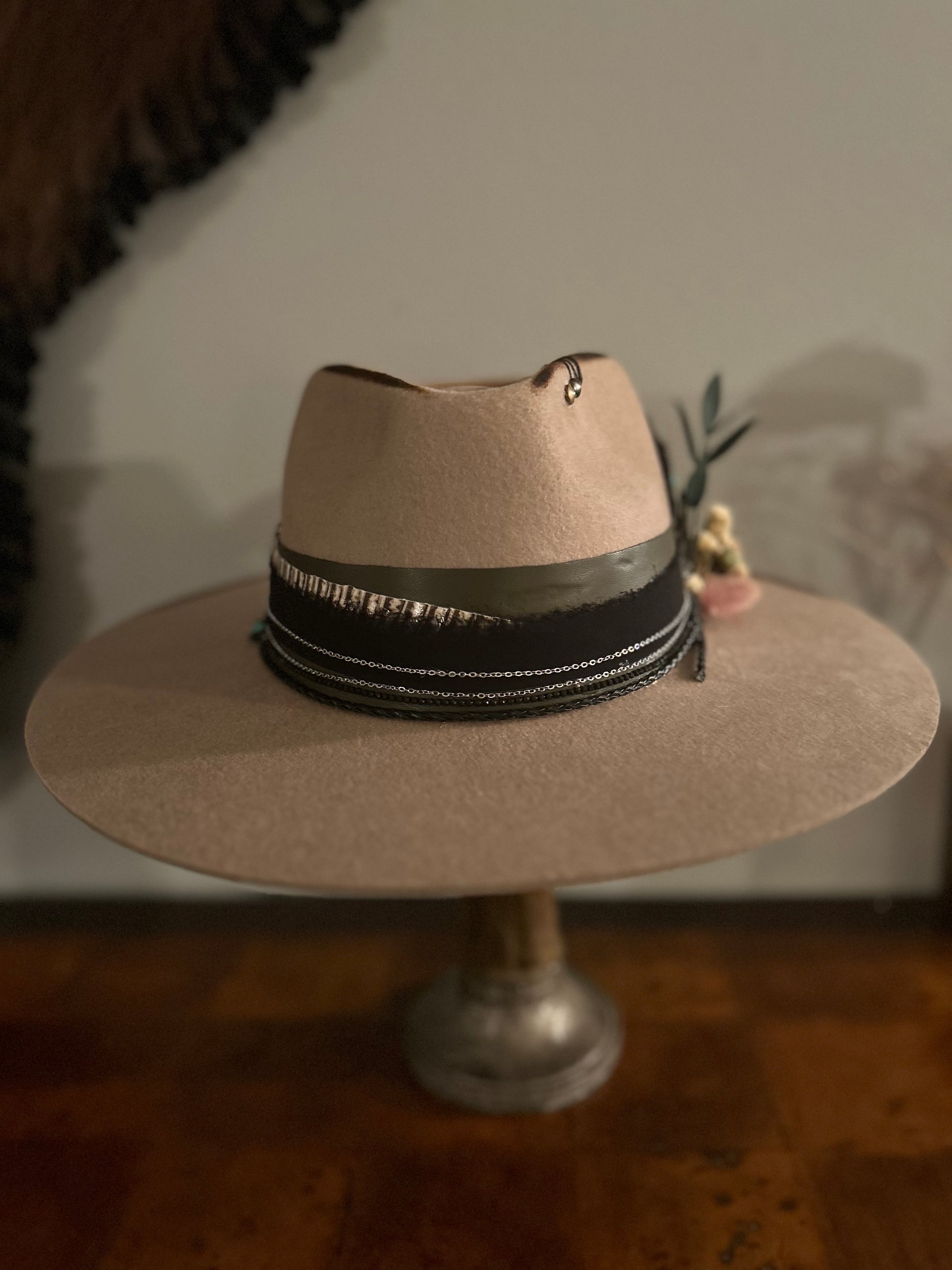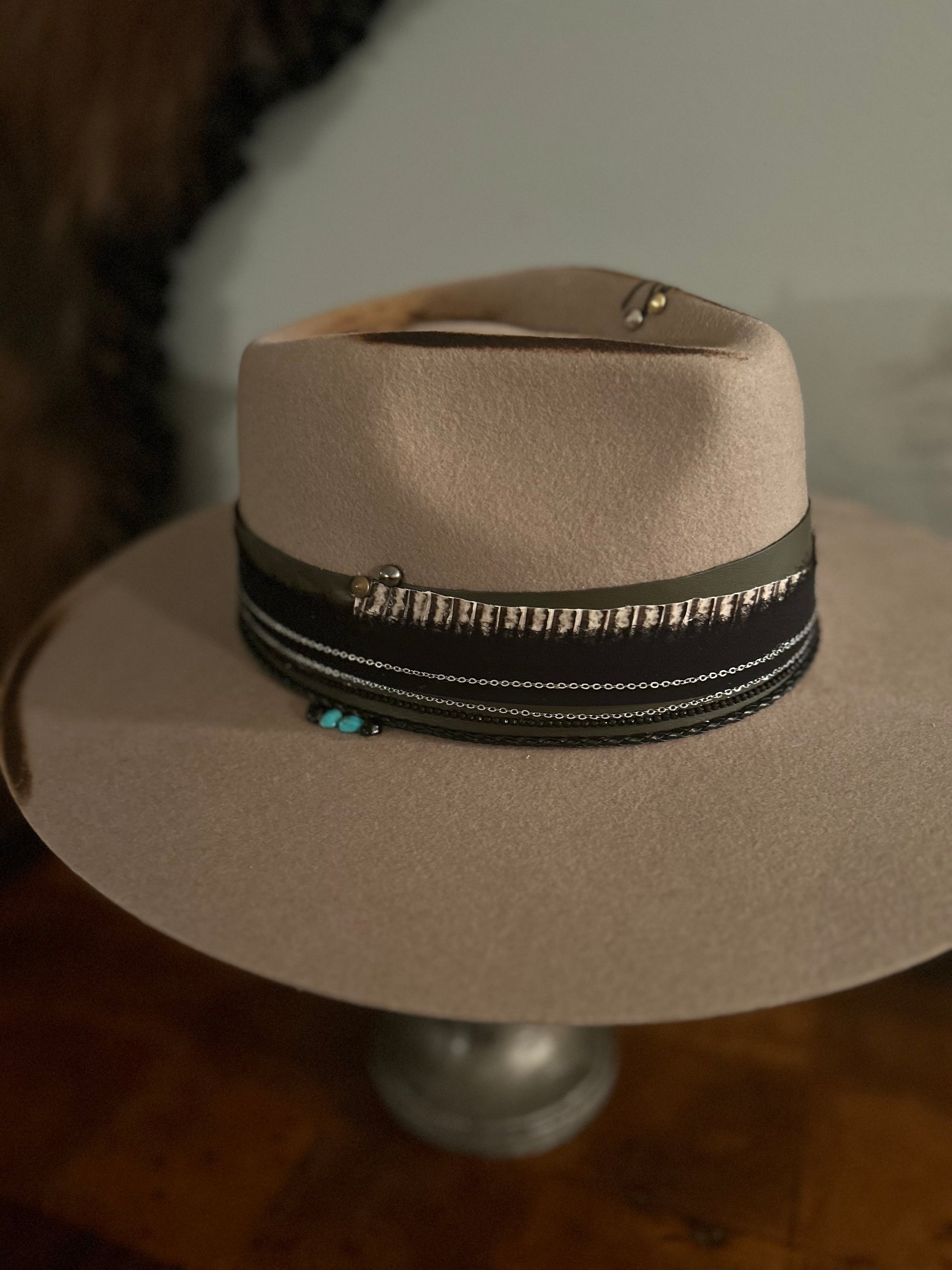 Tan 100% wool rancher with olive green pleather band, with faux snake skin, silver micro chain, turquoise accents, gold and gun metal rivets, black chiffon band, braided cord, burnishing, and stitching