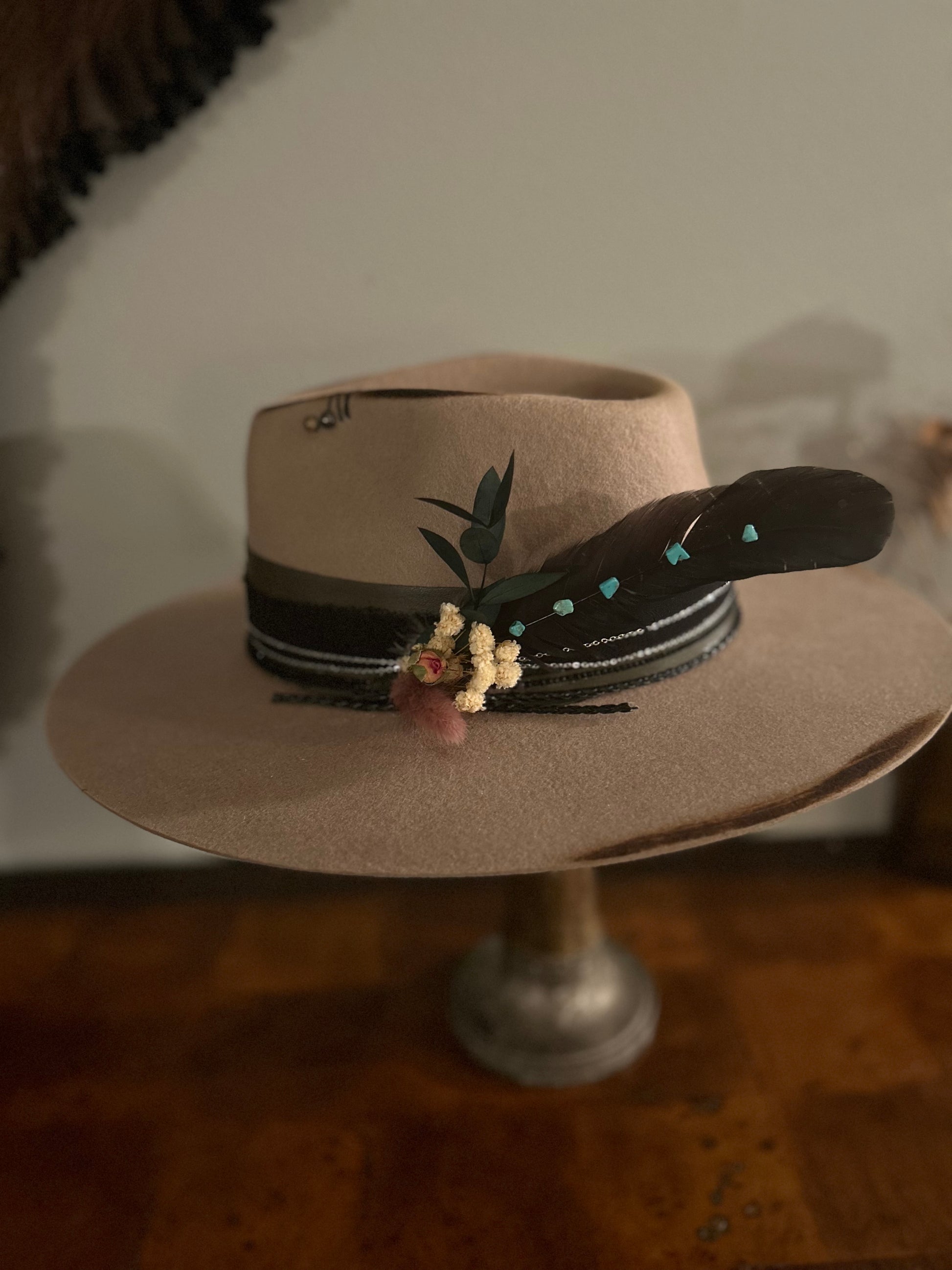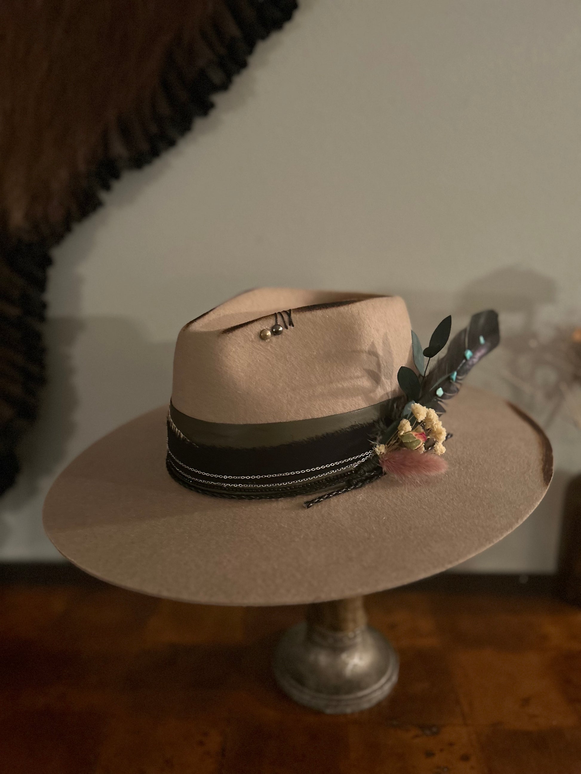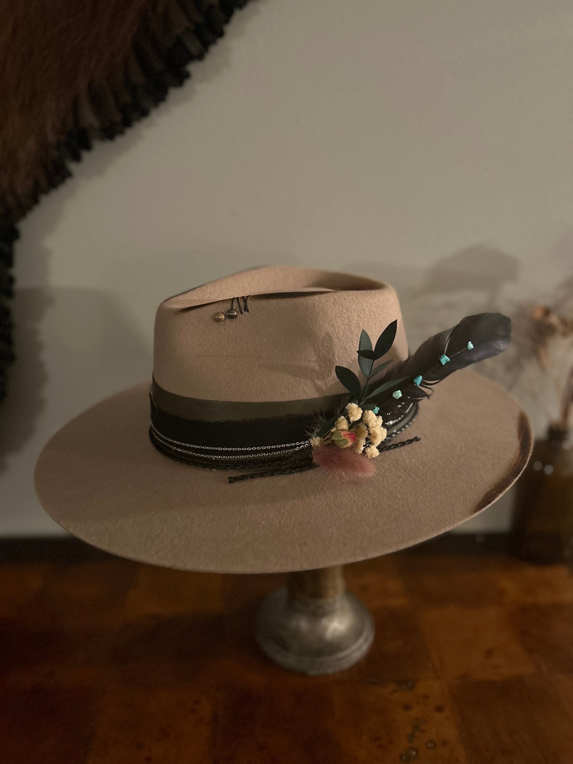 Tan 100% wool rancher with olive green pleather band, with faux snake skin, silver micro chain, turquoise accents, gold and gun metal rivets, black chiffon band, braided cord, burnishing, and stitching
