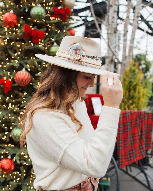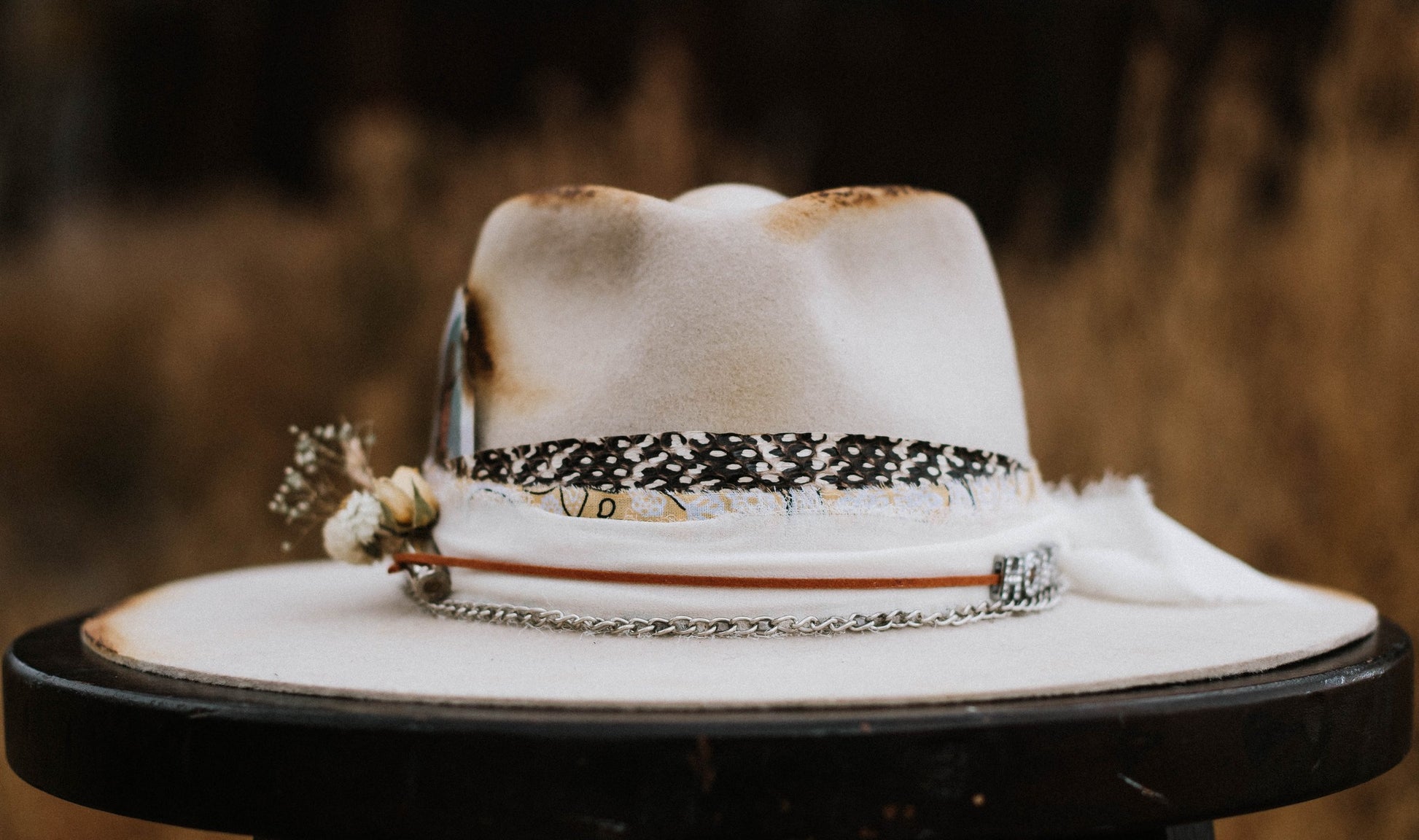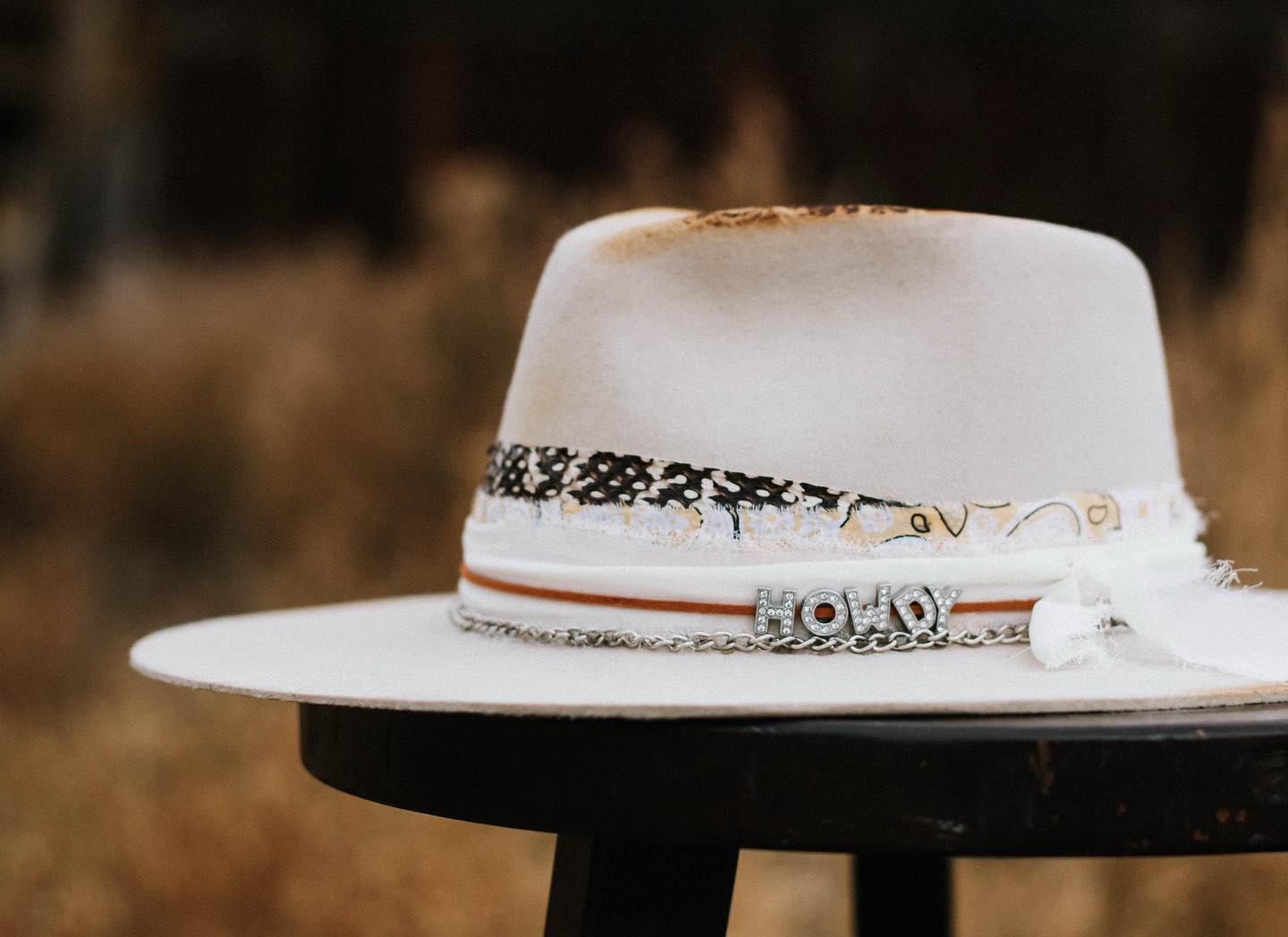 cream 100% wool rancher hat with a faux snake skin, cream chiffon ribbon band, leather cord, burnt Elvis Presley card, with burns on hat. floral arrangement.