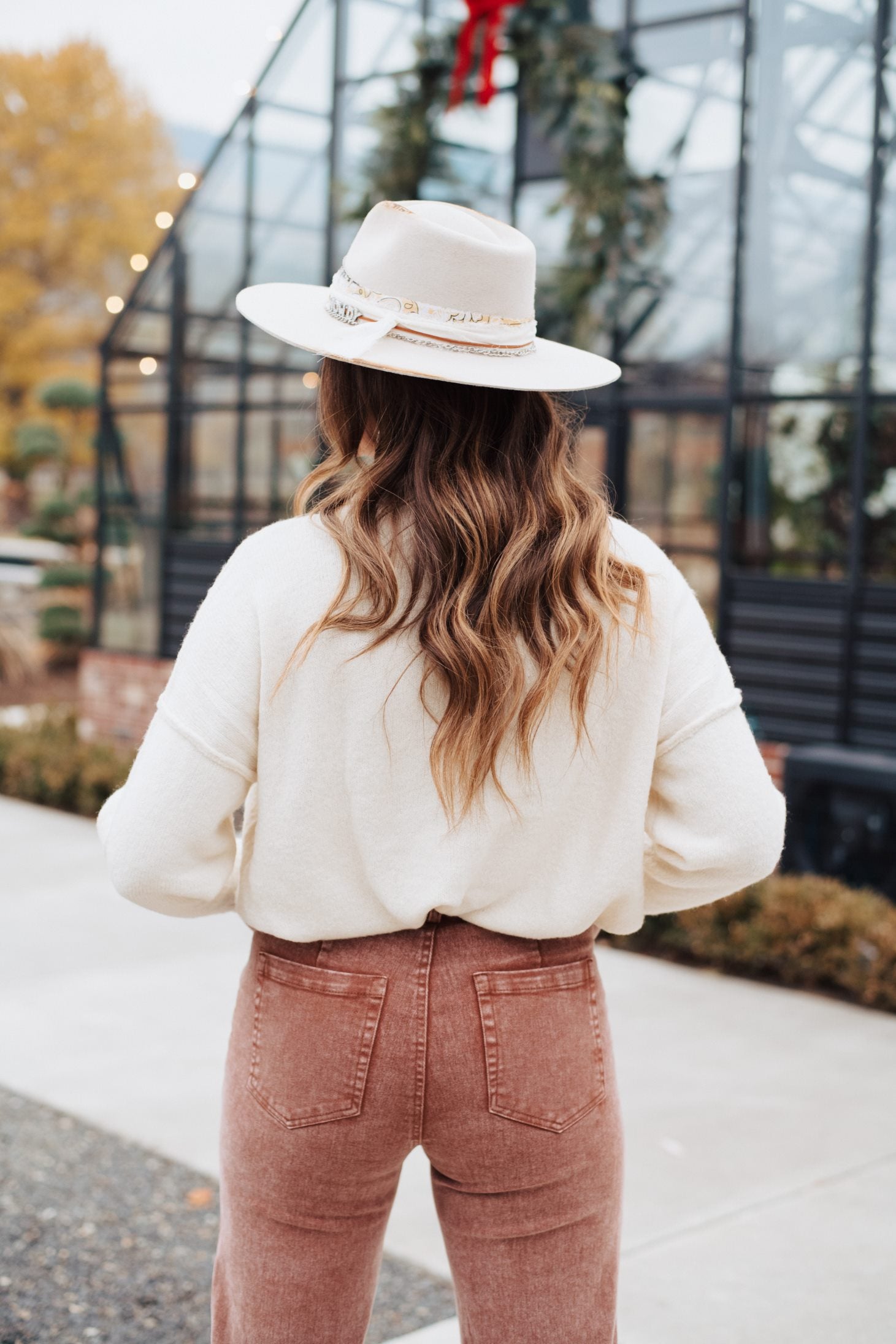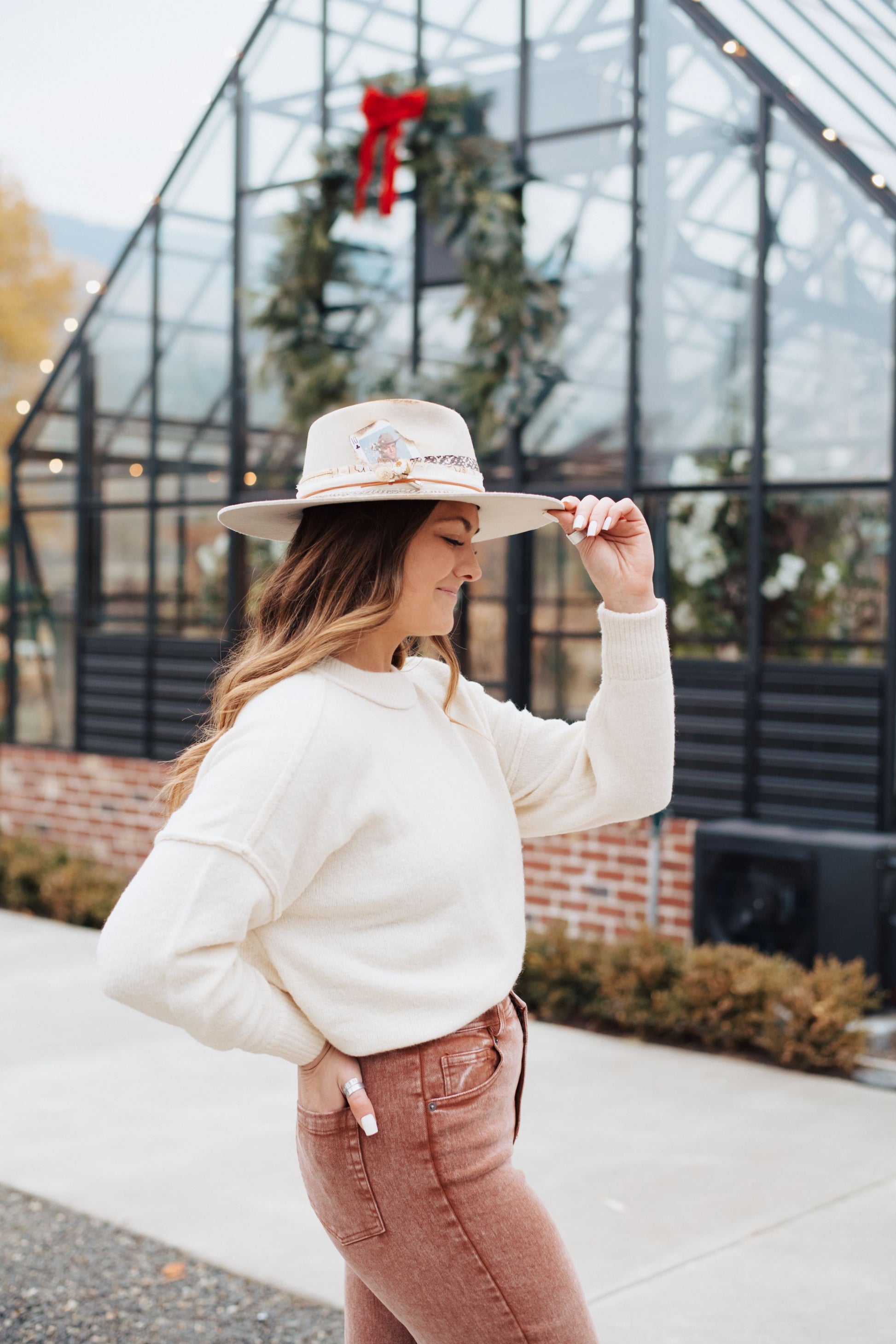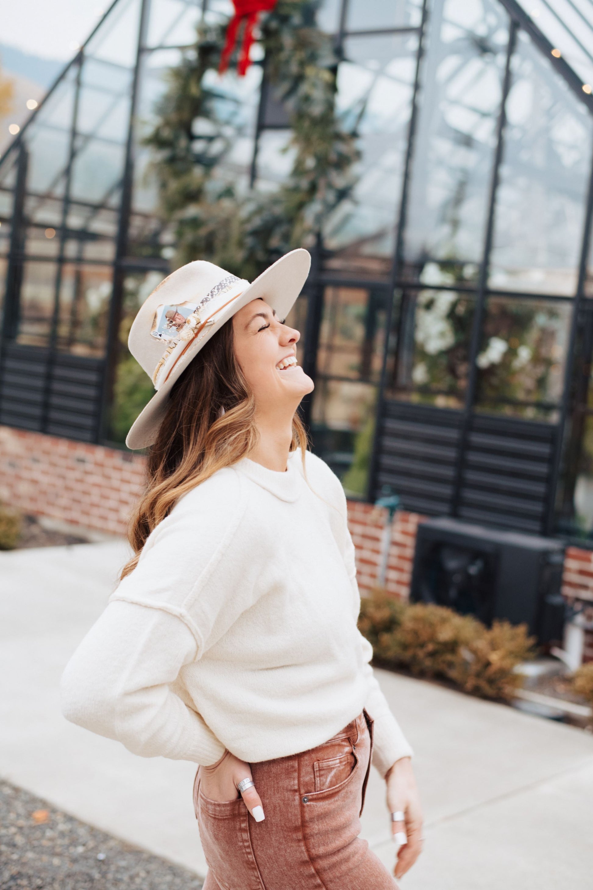 cream 100% wool rancher hat with a faux snake skin, cream chiffon ribbon band, leather cord, burnt Elvis Presley card, with burns on hat. floral arrangement.