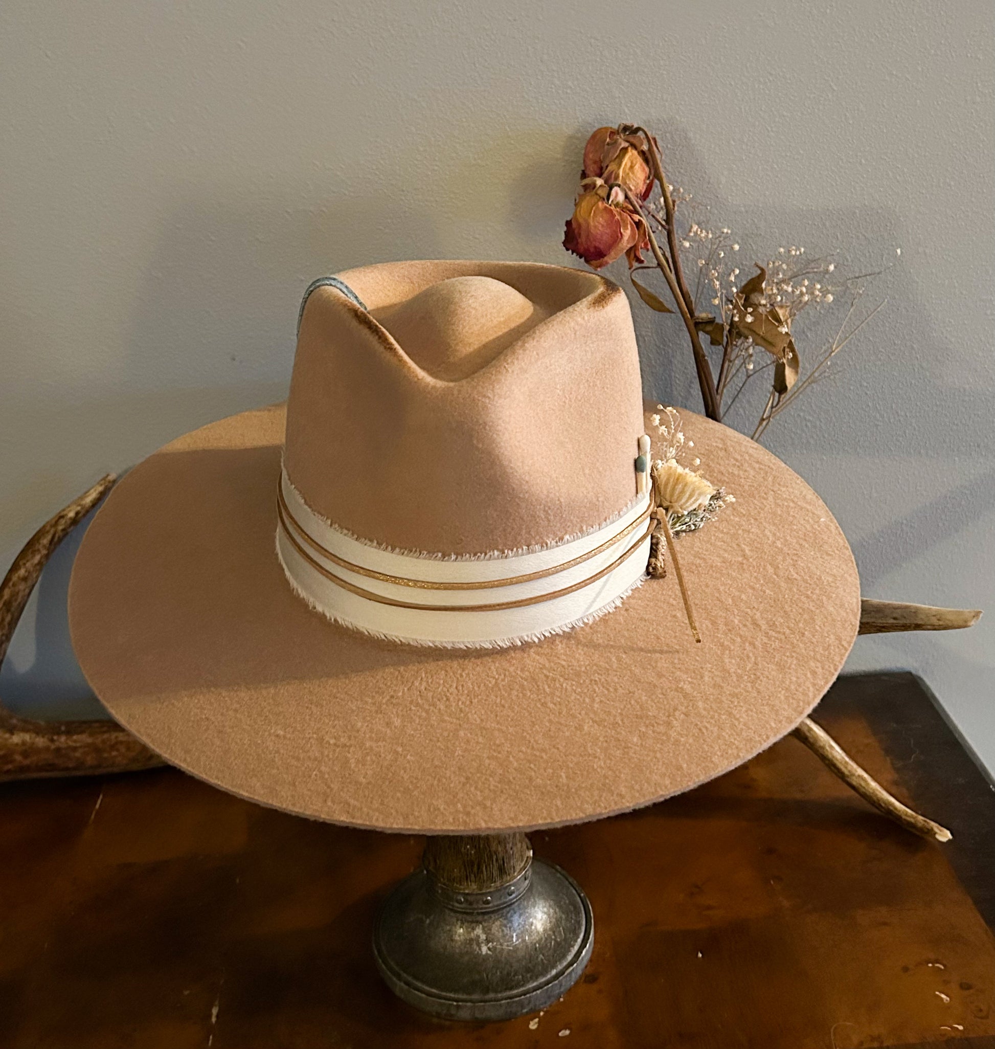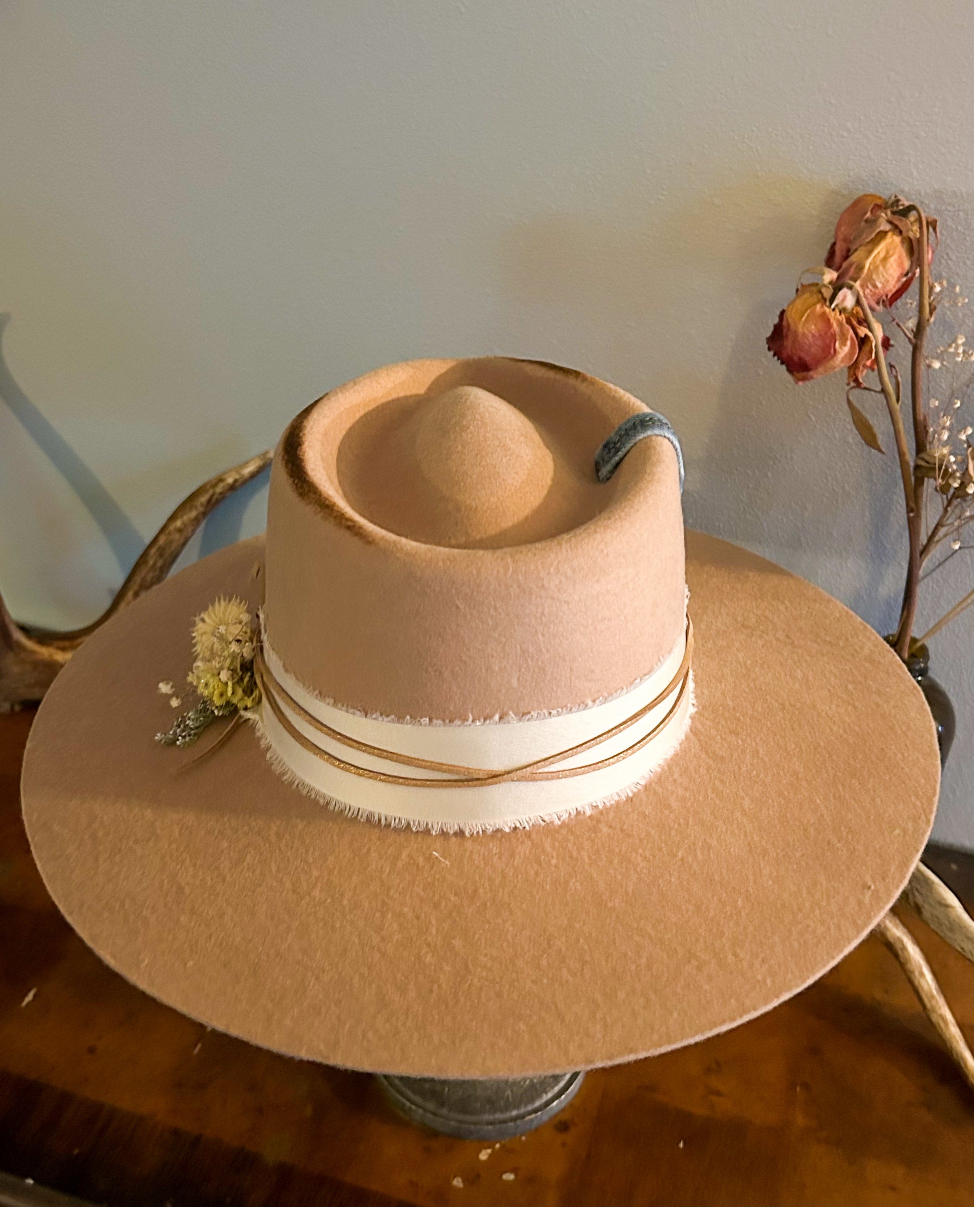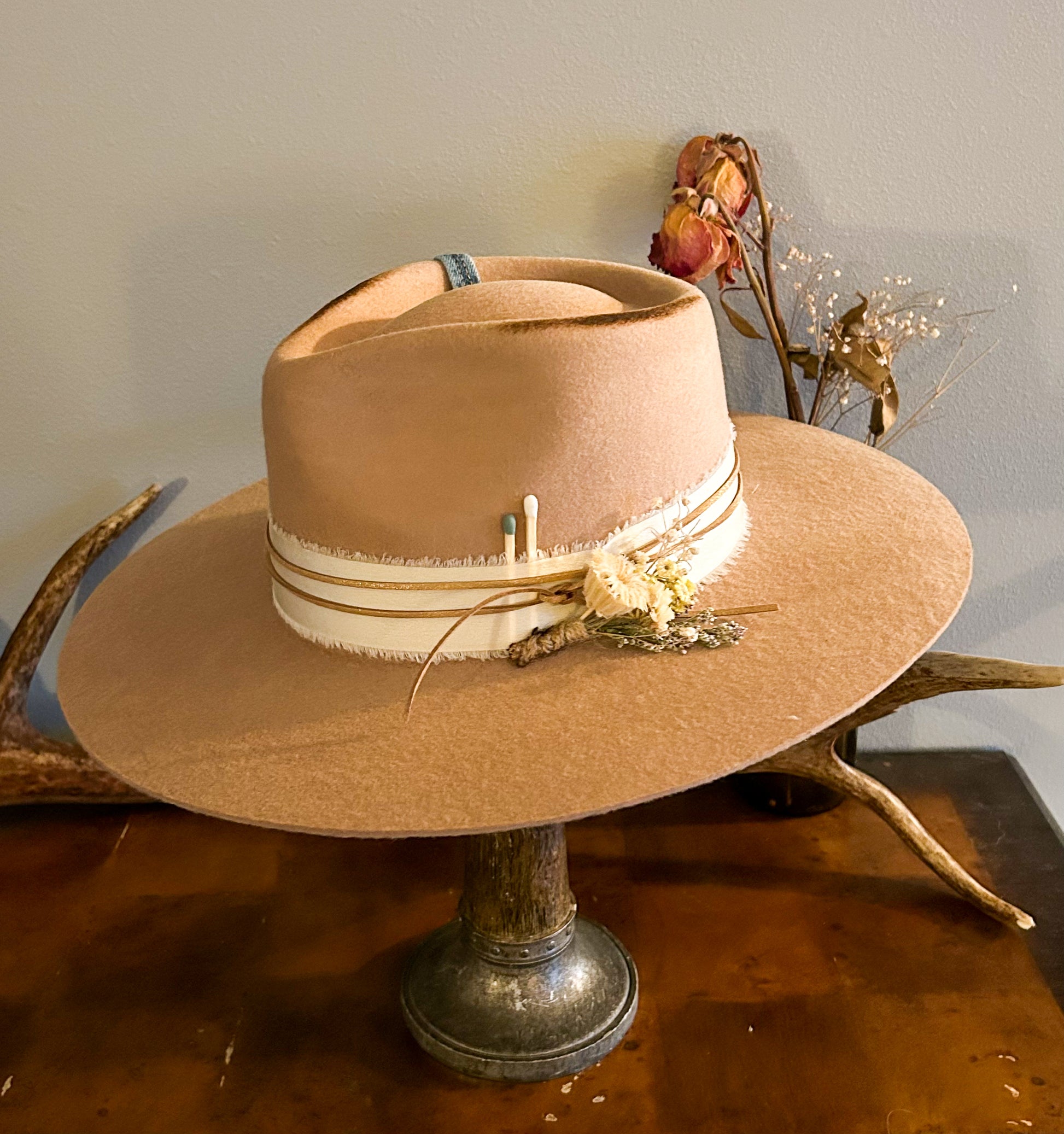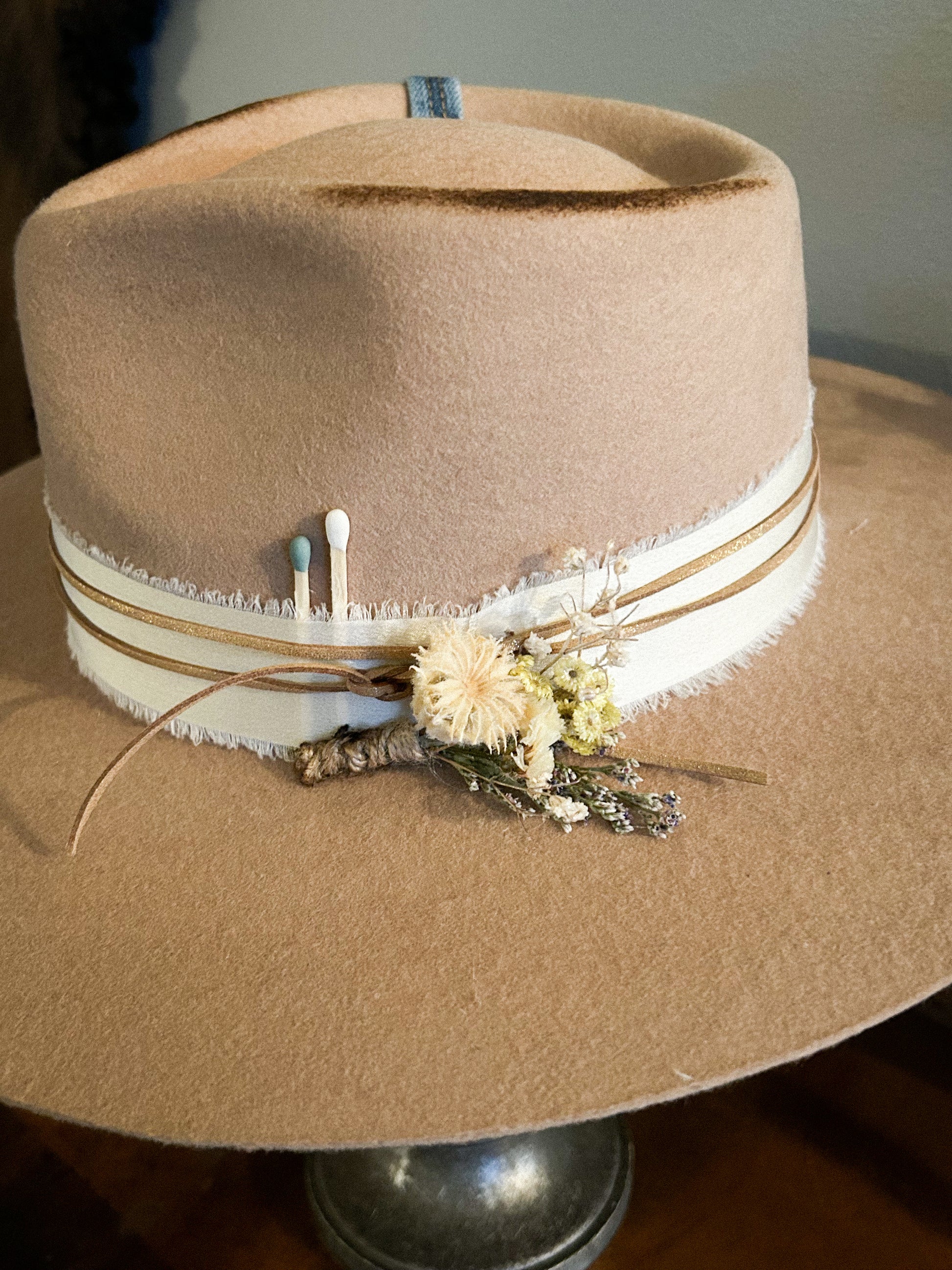 Tan rancher with cream silk ribbon, leather cord, floral embellishment.