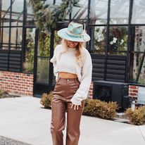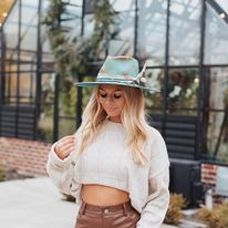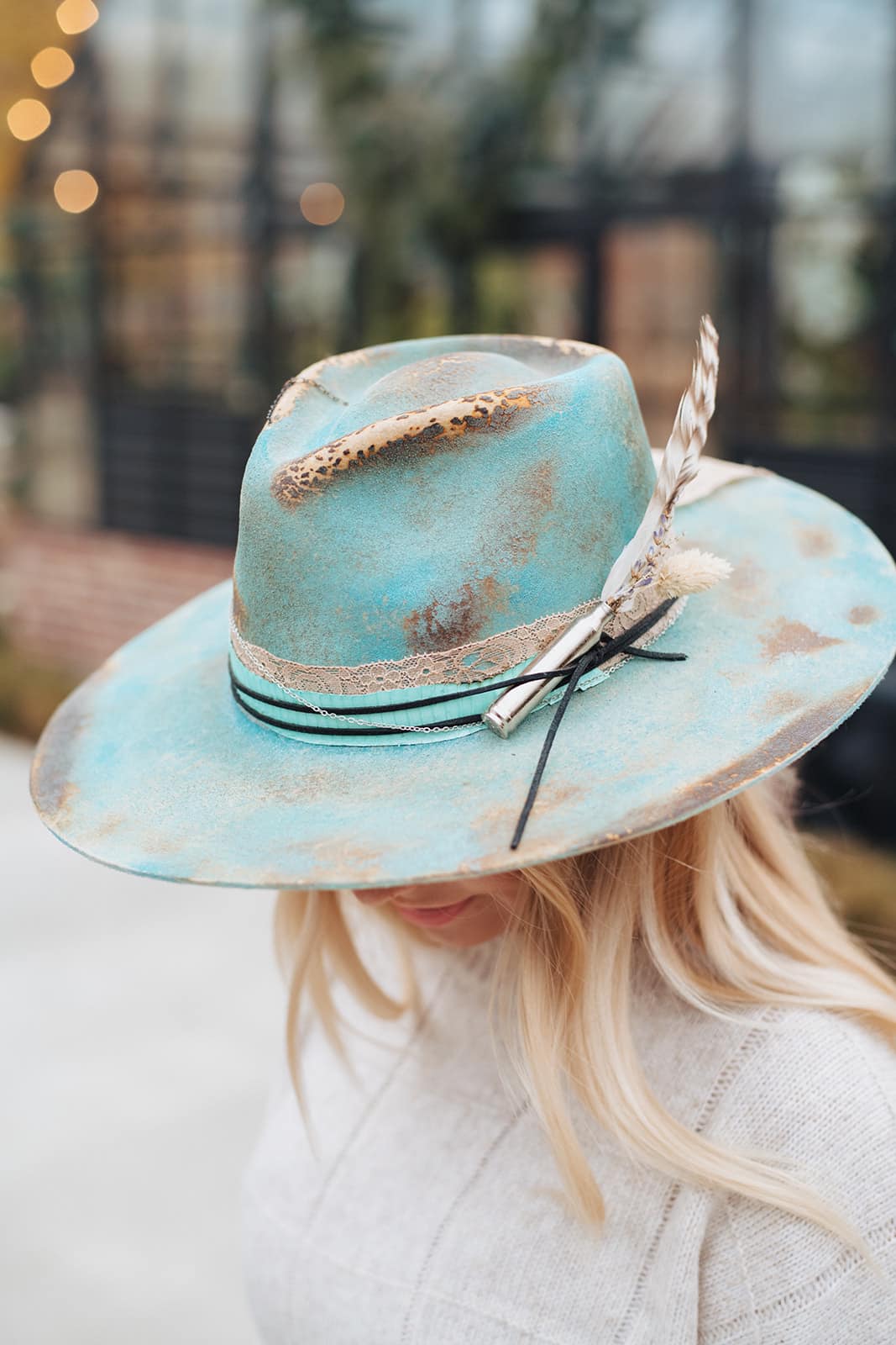 100% wool rancher hat with blue pops of color with burns and distressing through out the hat. baby blue faux snake skin with cream lace band, with black cord accent. silver bullet feather bundle.